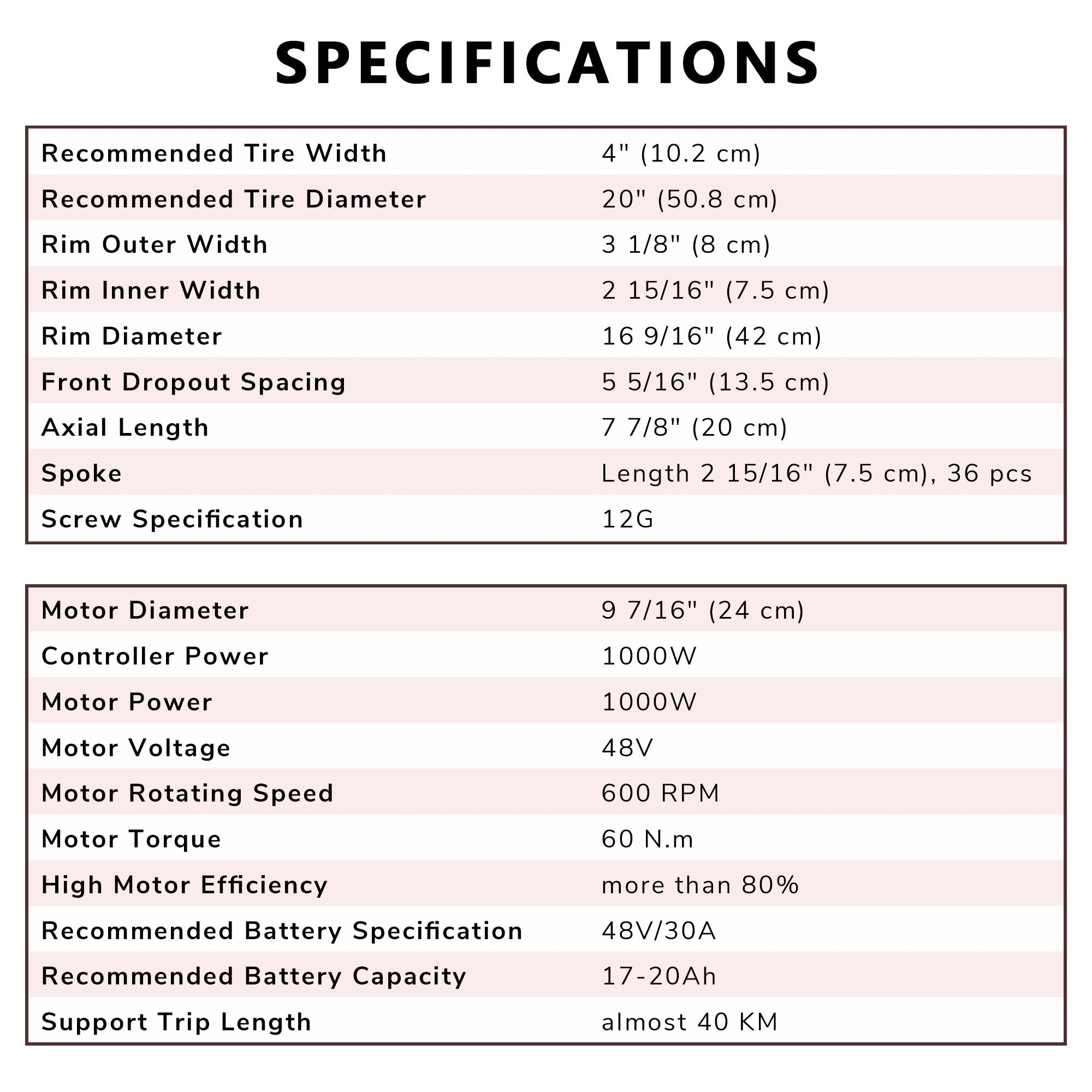 - 1x 20" Front Wheel with Brushless Hub Motor (Tire is not included)