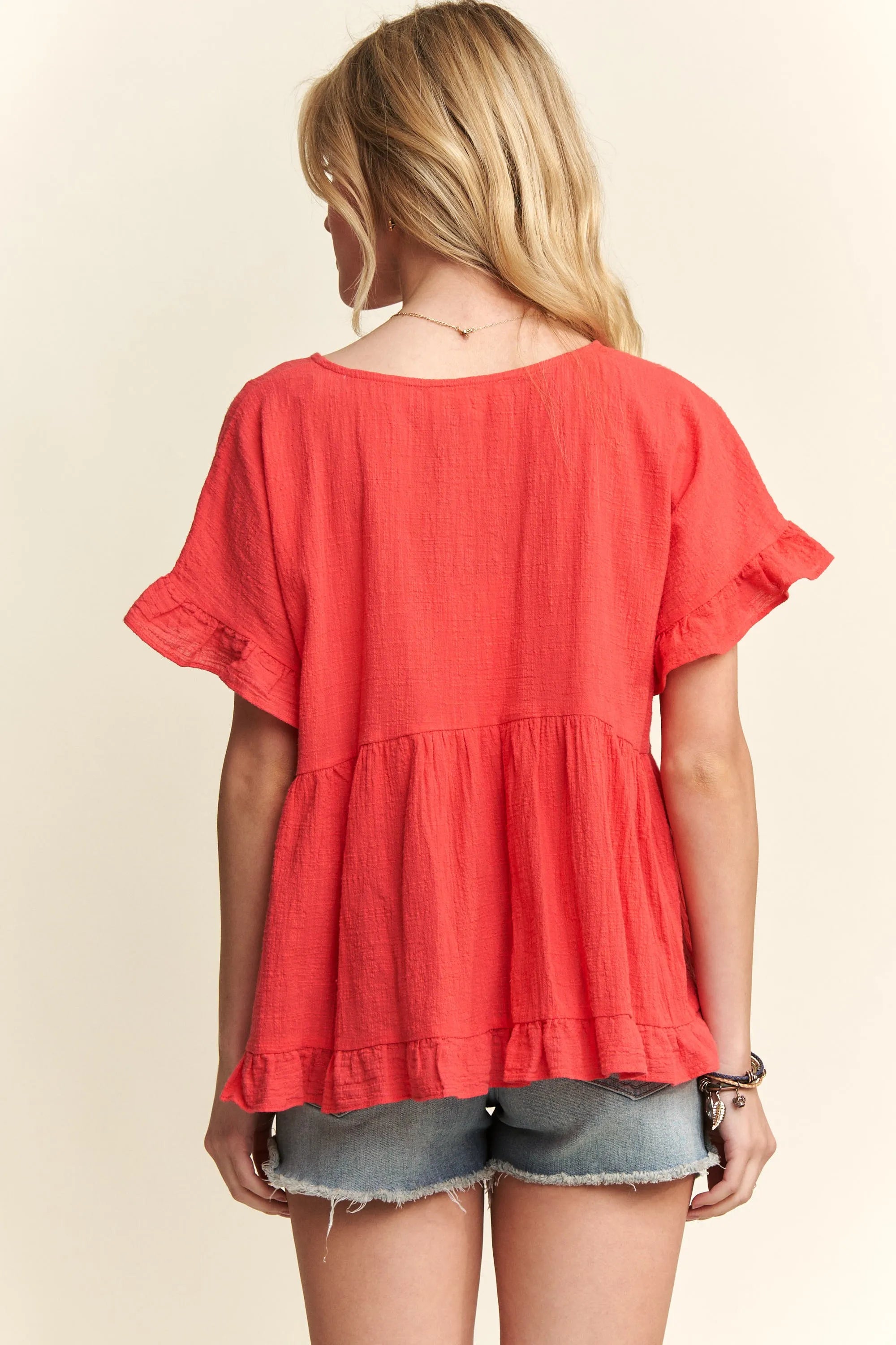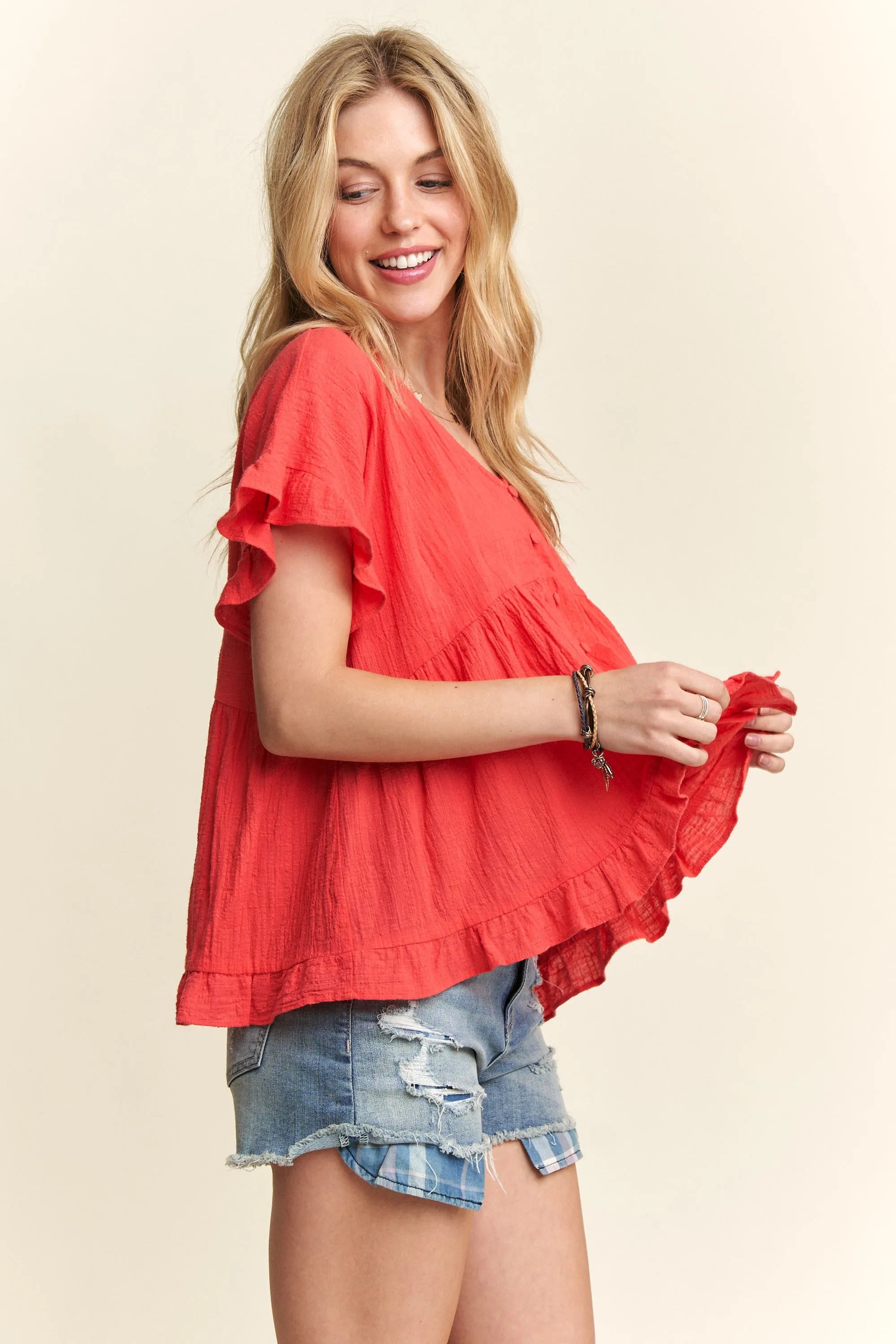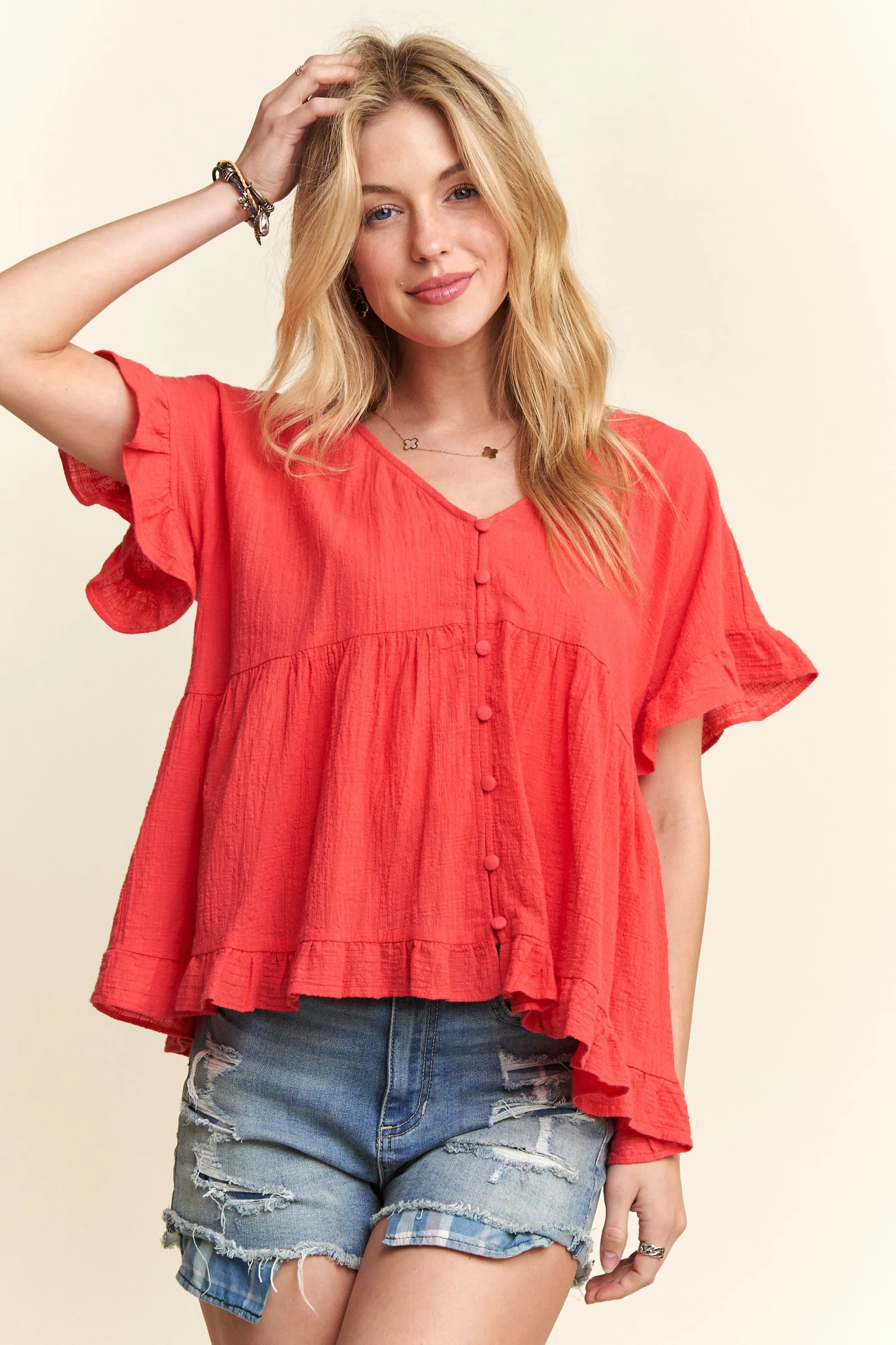 The Button Down Ruffled Babydoll Blouse is a feminine and charming top with ruffle details and a button-down front for... Read more