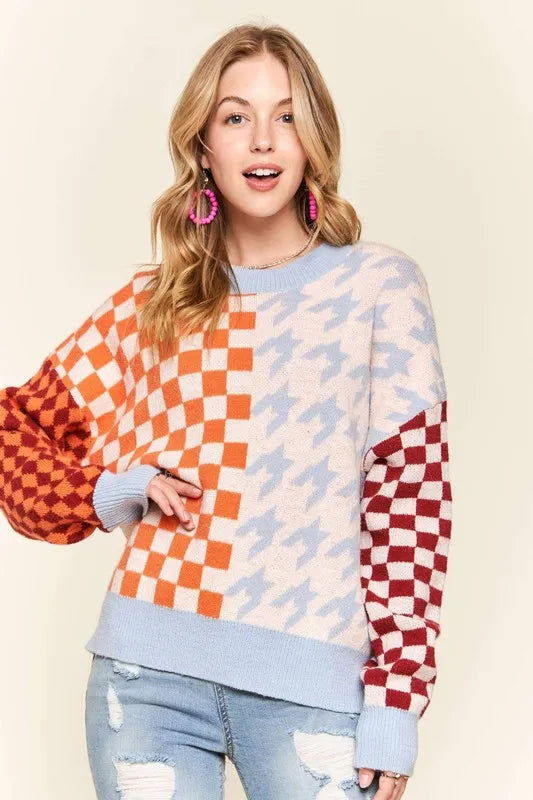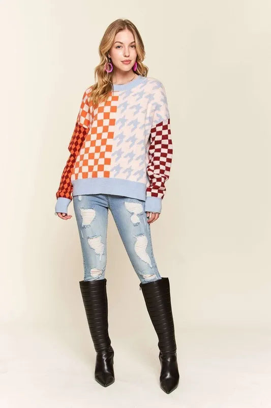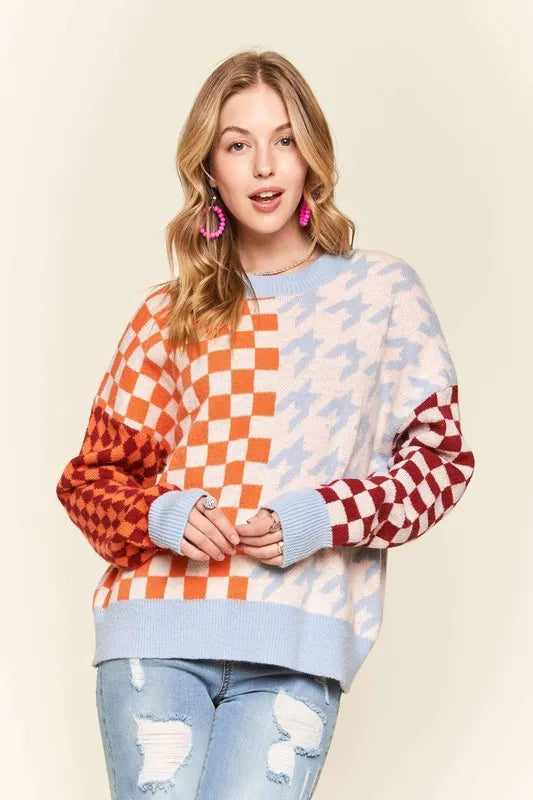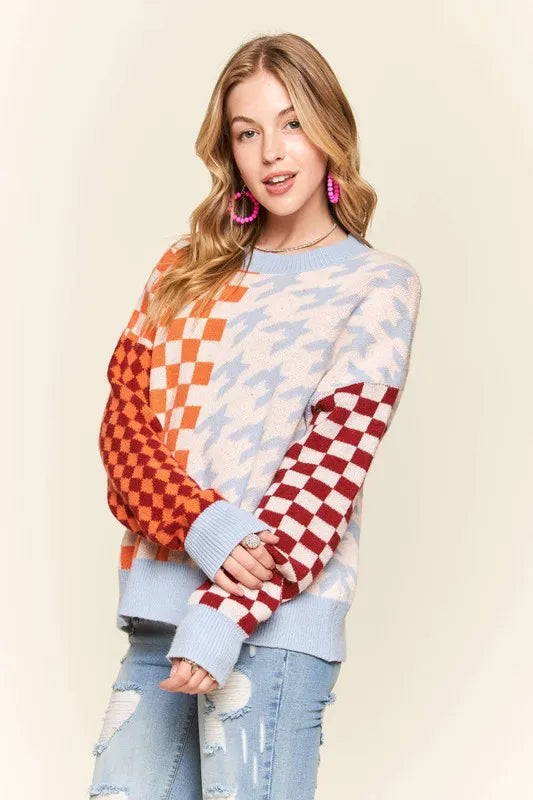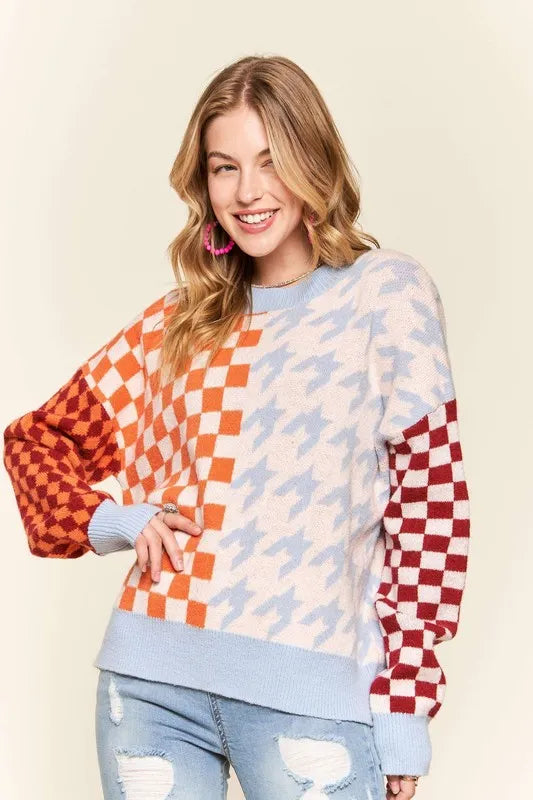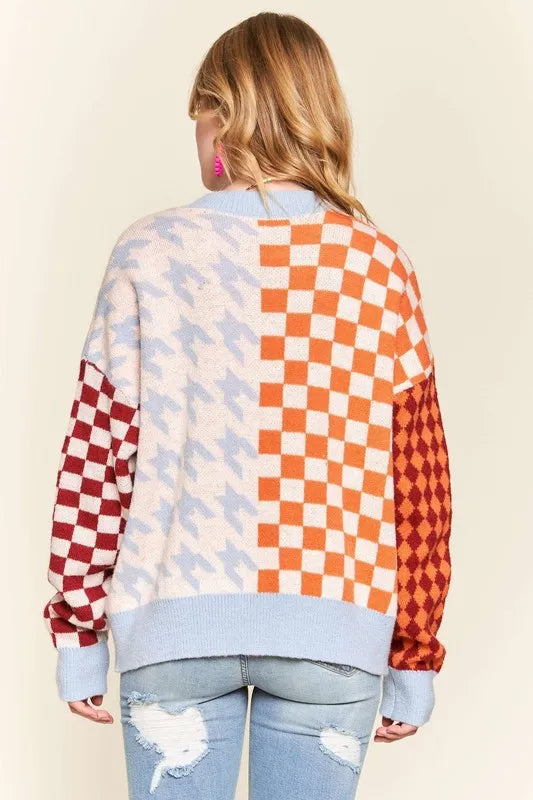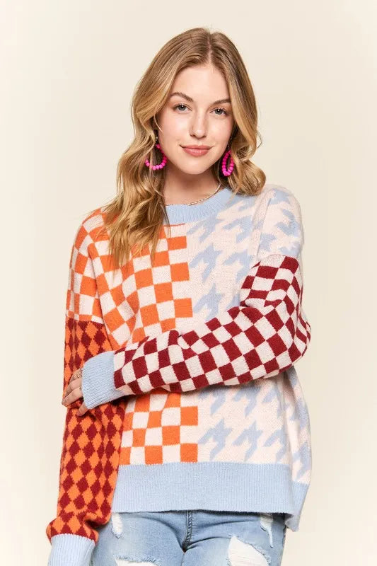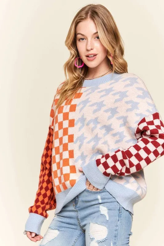 A checker and houndstooth sweater is a stylish and sophisticated choice that combines two classic patterns for a modern twist. This sweater features a checkerboard design and houndstooth pattern, creating a visually striking and unique look. The combination of these two timeless prints adds depth and interest to the sweater, making it a versatile option for both casual and dressy outfits. Pair it with solid-colored bottoms for a balanced and fashionable ensemble that is sure to make a statement.