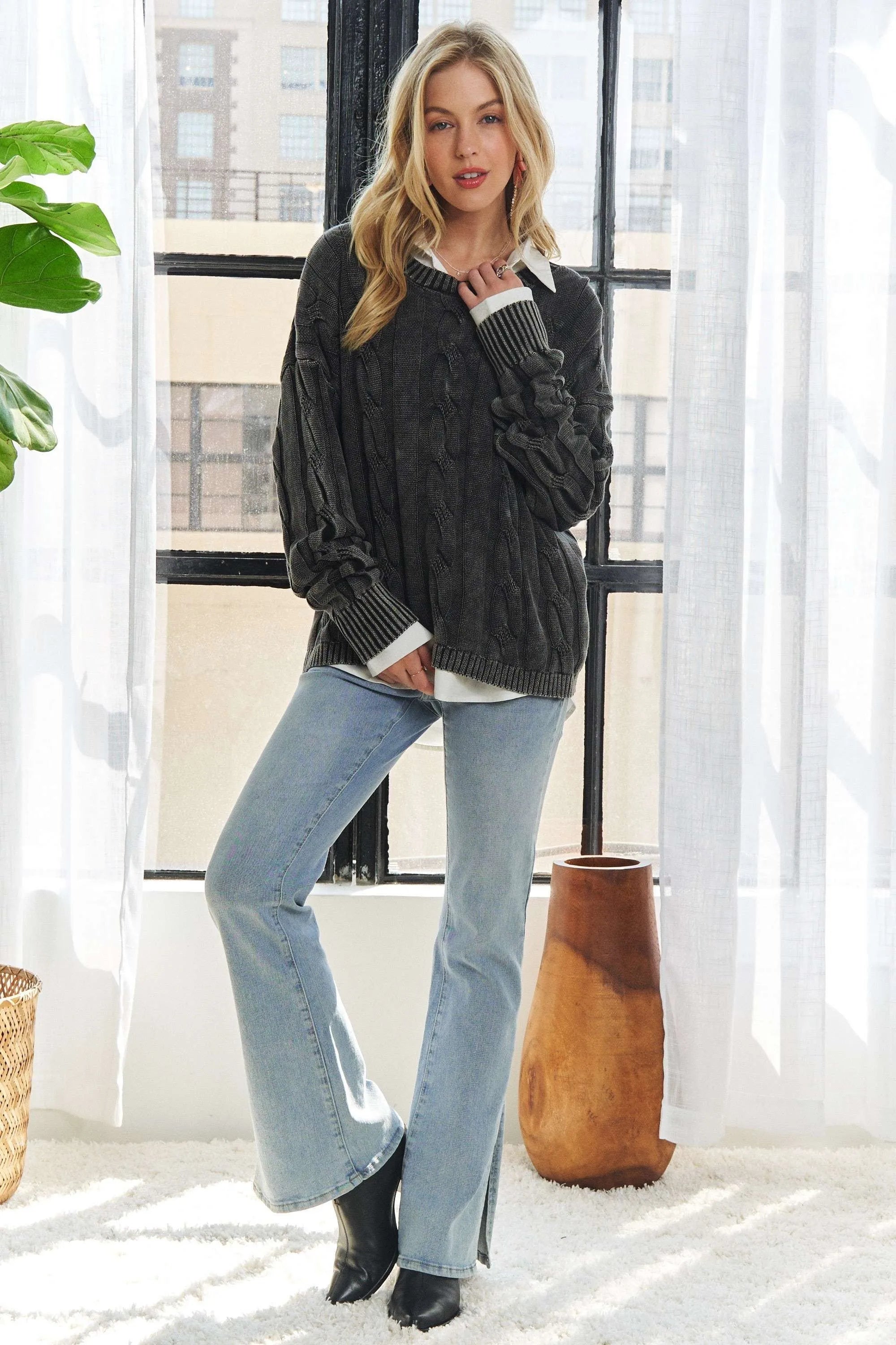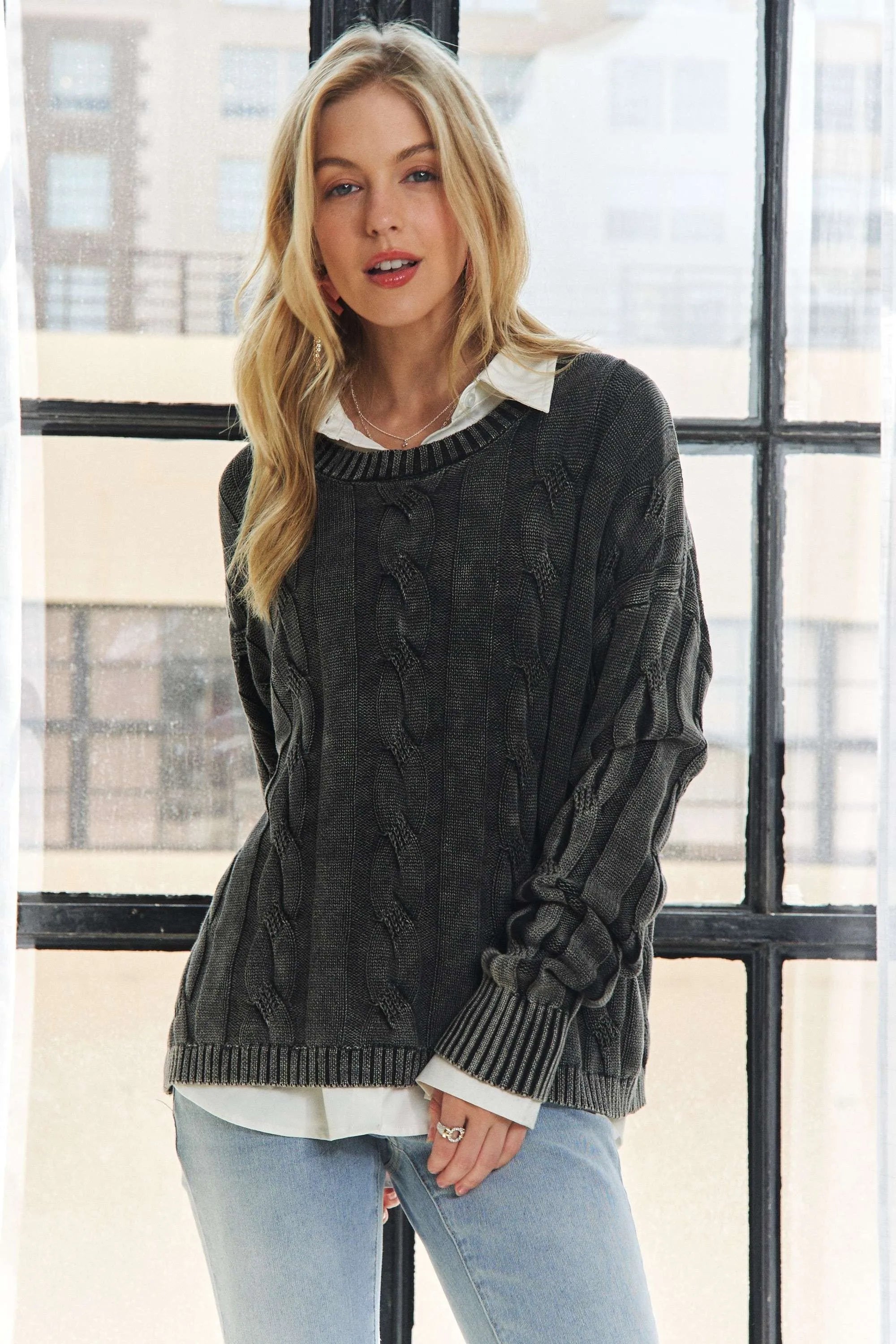 The mineral washed cable knit sweater top is a cozy and chic piece for your wardrobe. The mineral wash gives the sweater a unique and vintage look, adding depth and character to the fabric. The cable knit design provides texture and visual interest, creating a classic and timeless style. Perfect for cooler weather, this sweater top is both stylish and comfortable. Pair it with jeans or leggings for a cozy and effortless outfit. Embrace the laid-back and rustic vibe of this mineral washed cable knit sweater top for a trendy and relaxed ensemble.