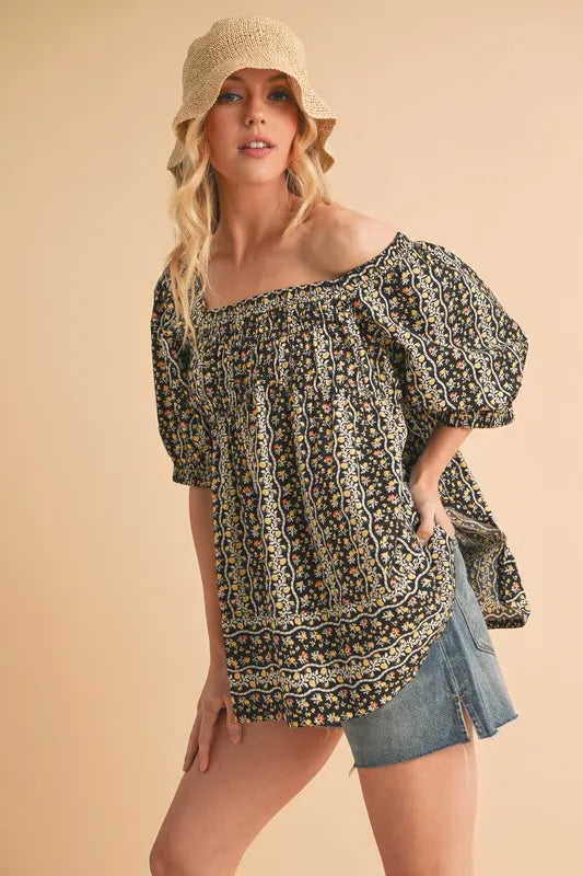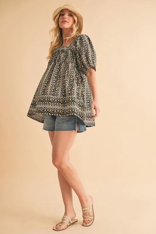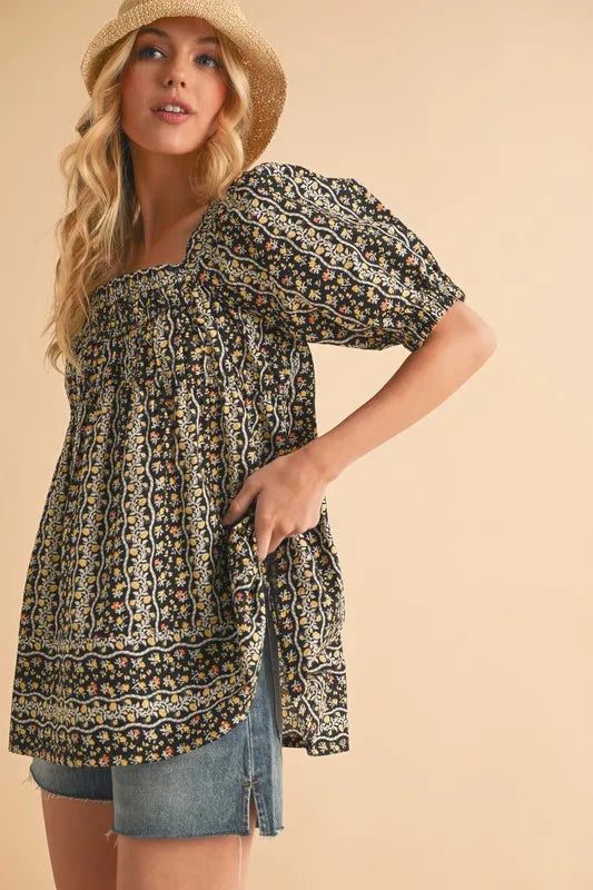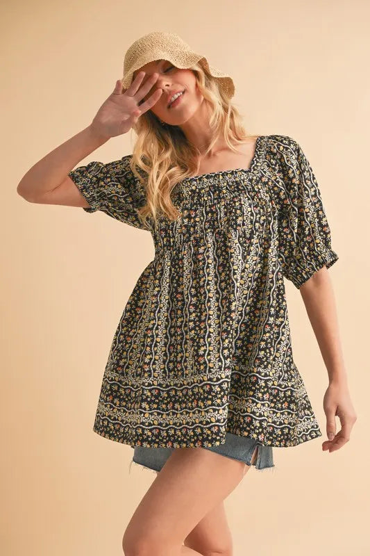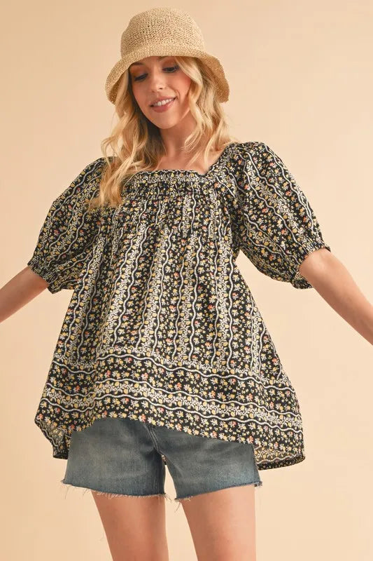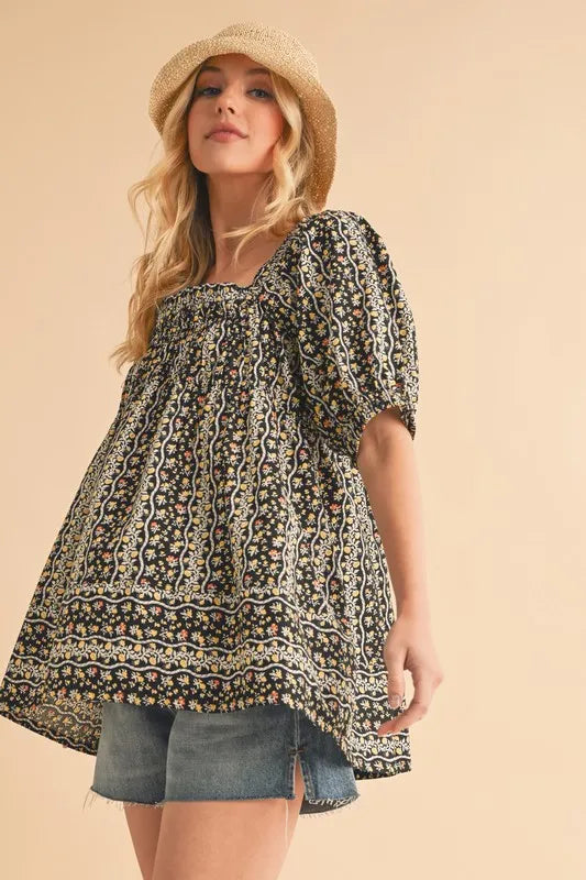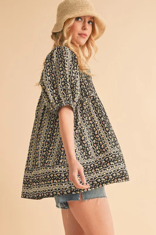 The floral short sleeve babydoll top is a charming and feminine addition to your wardrobe. The floral print adds a touch of romance and whimsy to the top. The babydoll silhouette creates a flirty and flattering look that is perfect for various occasions. The short sleeves are ideal for staying cool in warmer weather. Pair this top with jeans or shorts for a relaxed and effortless outfit, or dress it up with a skirt and heels for a more polished ensemble.