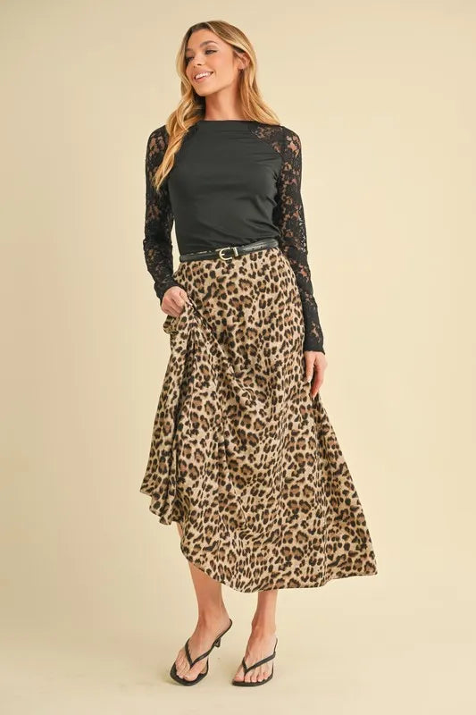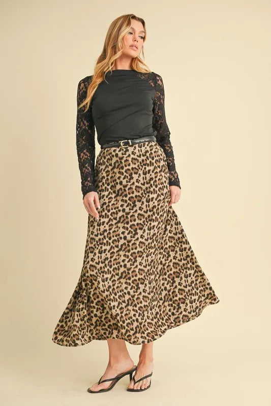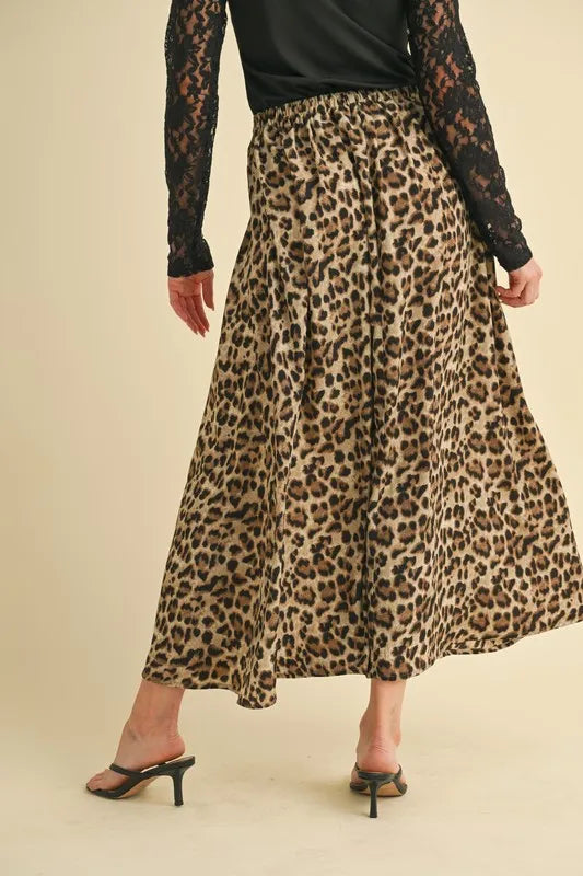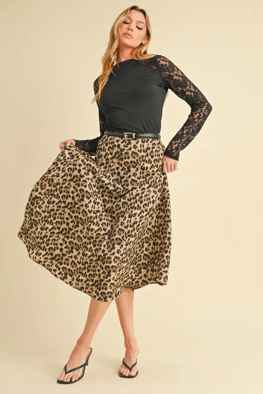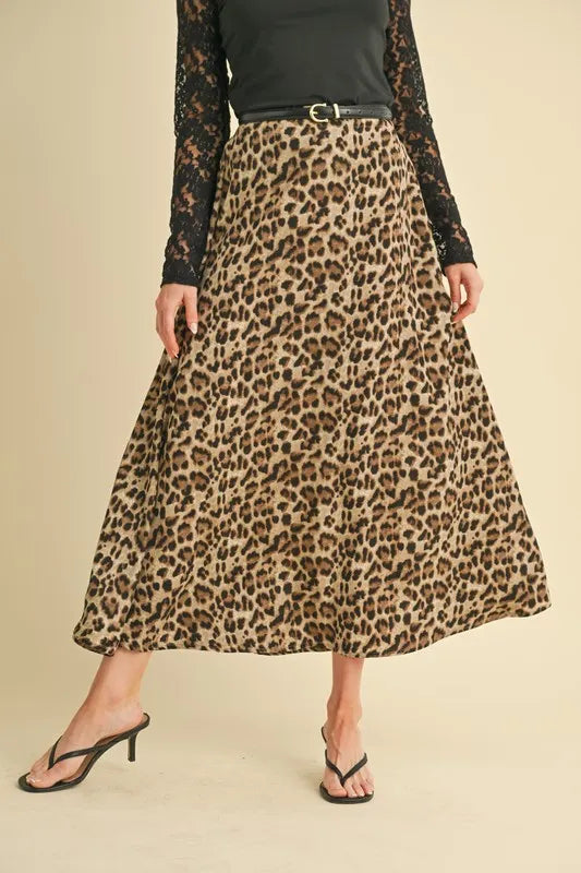 A leopard midi skirt is a trendy and versatile piece for adding a touch of animal print to your wardrobe. The midi length falls below the knee, offering a chic and flattering silhouette suitable for various occasions. The leopard print design adds a bold and stylish statement to your outfit, perfect for dressing up or down with different tops and accessories. Pair this skirt with a simple blouse or a graphic tee for a fashion-forward look.