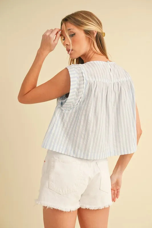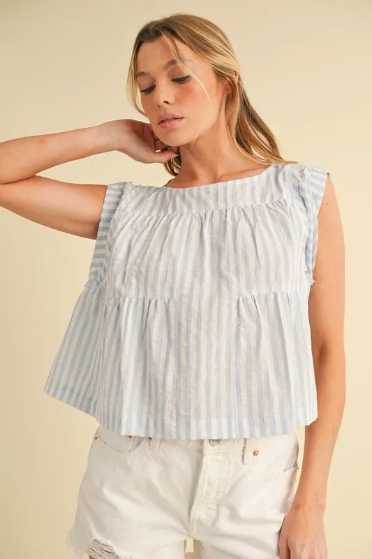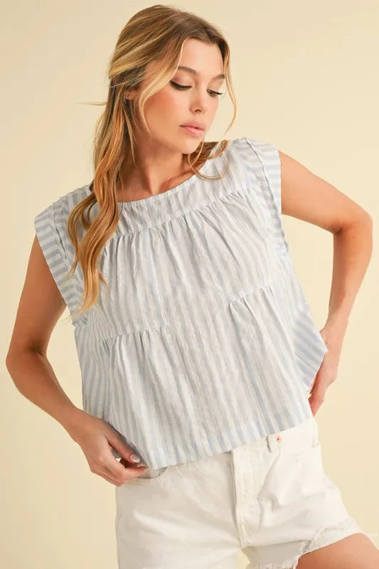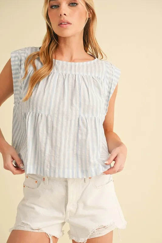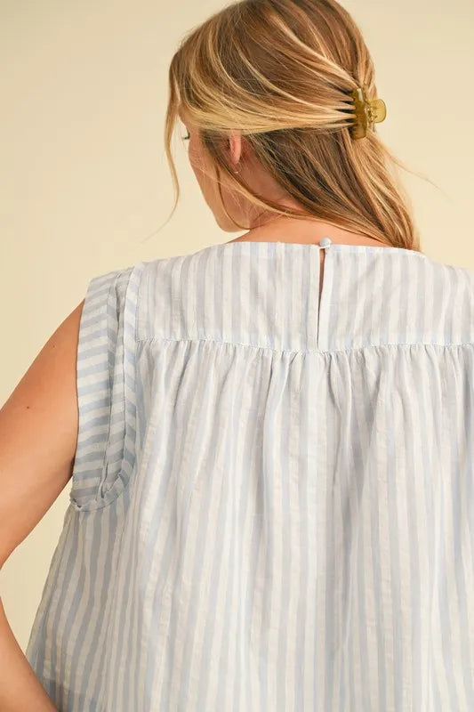 The ruched striped round neck sleeveless top is a chic and stylish choice for your summer wardrobe. The ruched detailing adds a touch of texture and visual interest to the top. The striped pattern is classic and versatile, perfect for mixing and matching with other pieces. This sleeveless top is great for staying cool and comfortable on warm days. Pair it with high-waisted jeans or a skirt for a casual yet put-together look that is perfect for any occasion.