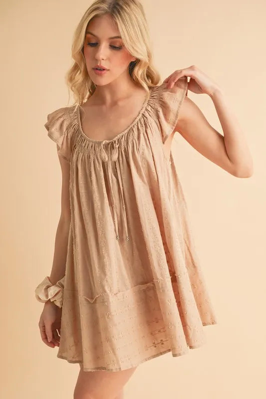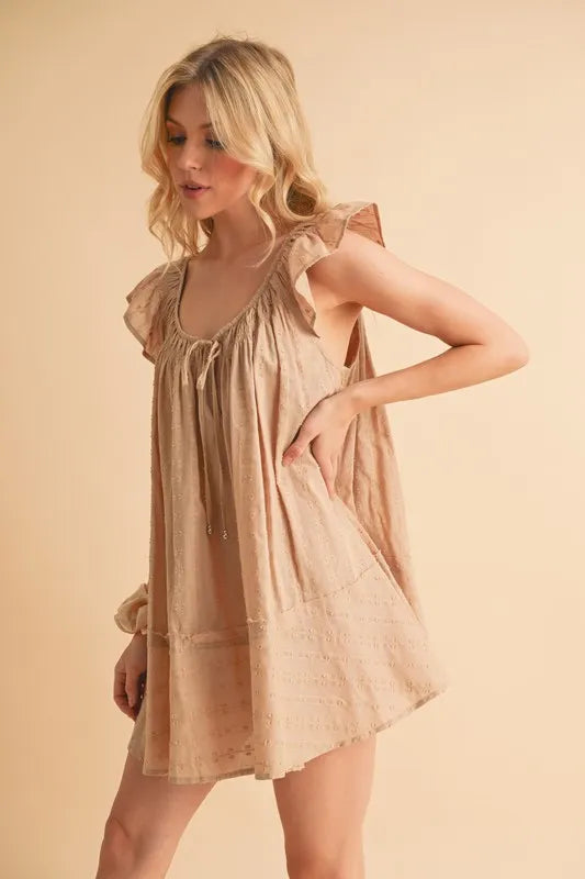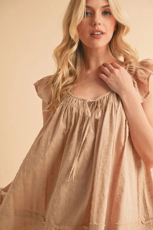 A ruffled cap sleeve cotton tunic mini dress is a stylish and feminine piece for your wardrobe. The ruffled cap sleeves add a cute and playful touch to the dress, while the tunic style offers a relaxed and comfortable fit. Made of cotton, this dress is breathable and perfect for warm weather. It can be dressed up or down for various occasions, making it a versatile and chic choice.