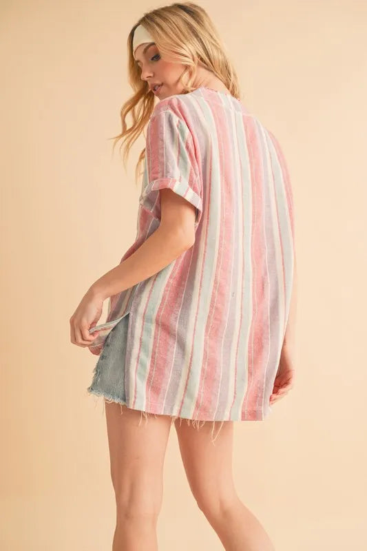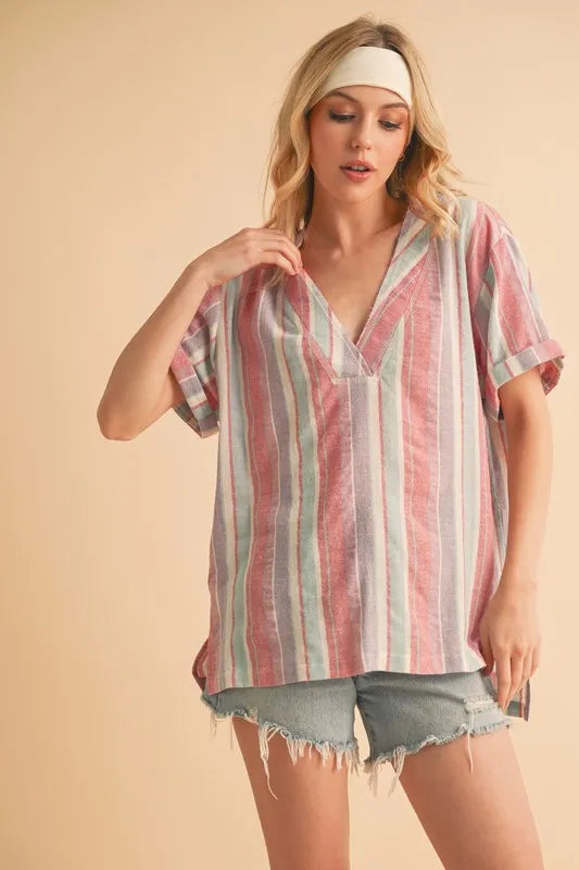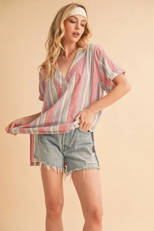 The side slit striped short sleeve blouse is a chic and versatile piece for your wardrobe. The side slits add a touch of modernity and flair to the classic striped blouse. The short sleeves offer a breezy and comfortable fit for warmer days. This blouse is perfect for both casual and dressy occasions, providing a polished and sophisticated look. Pair it with tailored pants for a professional outfit, or with jeans for a more laid-back and effortless style.