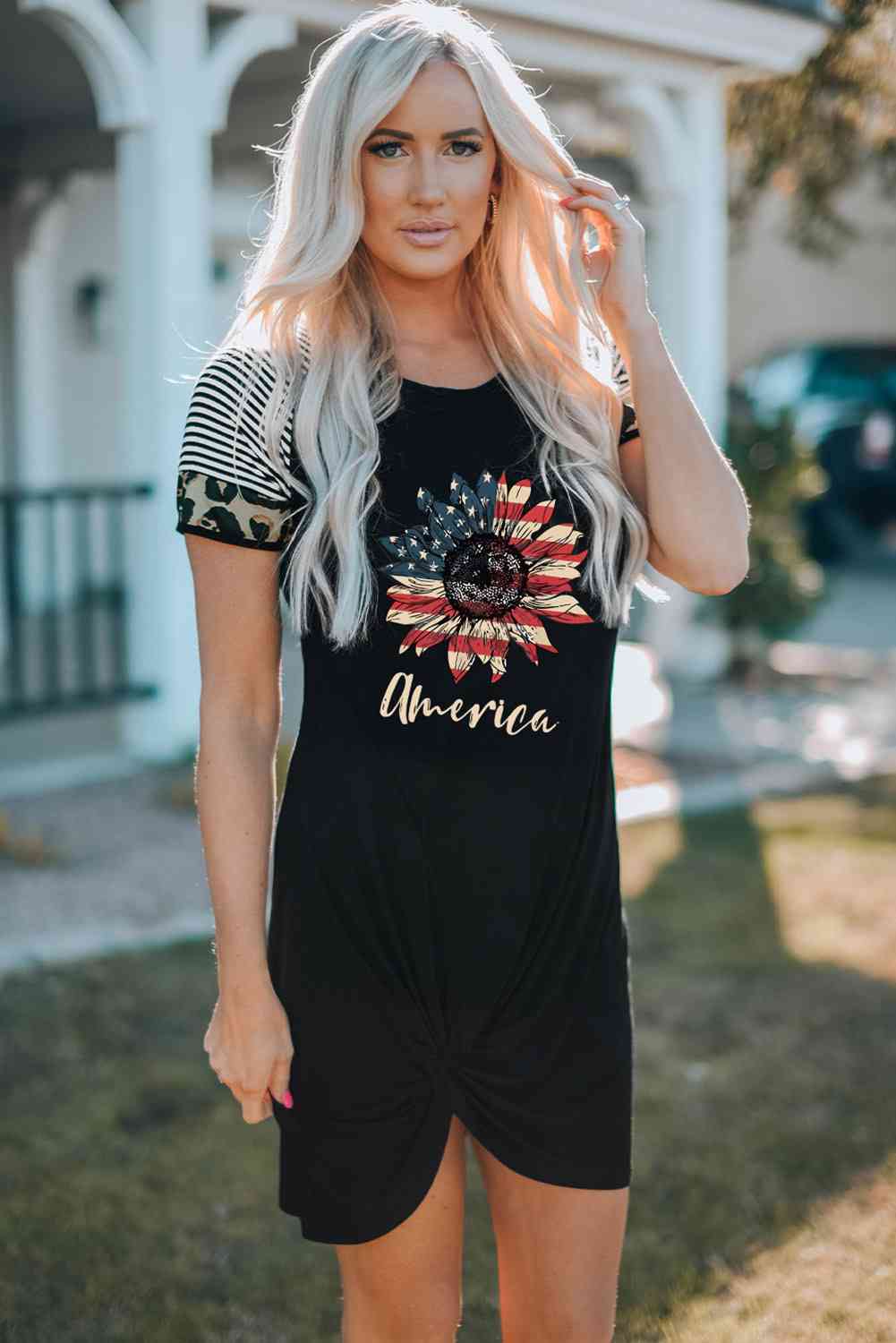 Pattern type: Solid, Graphic Style: Casual Features: Twisted Neckline: Round neck Length: Mini Sleeve length: Short sleeves Sleeve type: Raglan... Read more