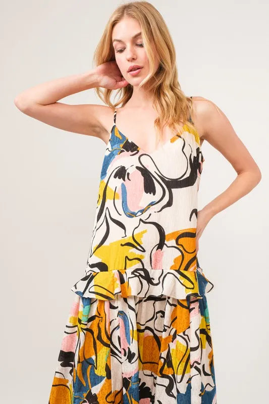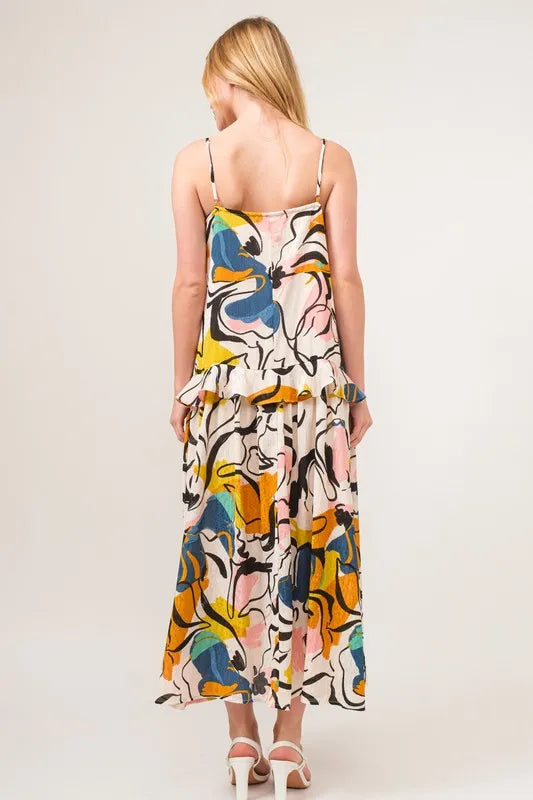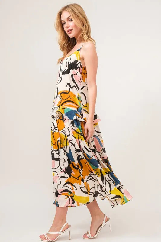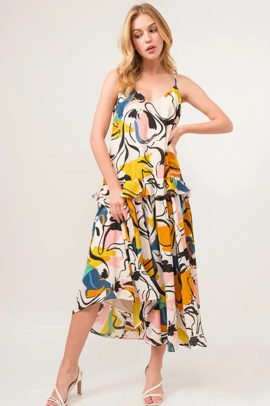 The ruffled abstract floral printed midi cami dress is a charming and feminine option for your wardrobe. The ruffled details add a playful and romantic touch to the dress. The abstract floral print is vibrant and eye-catching, perfect for adding a pop of color to your look. This midi cami dress is versatile and can be dressed up for a special event or dressed down for a casual outing. Pair it with heels and statement earrings for a dressed-up look, or with sandals and a denim jacket for a more relaxed vibe.