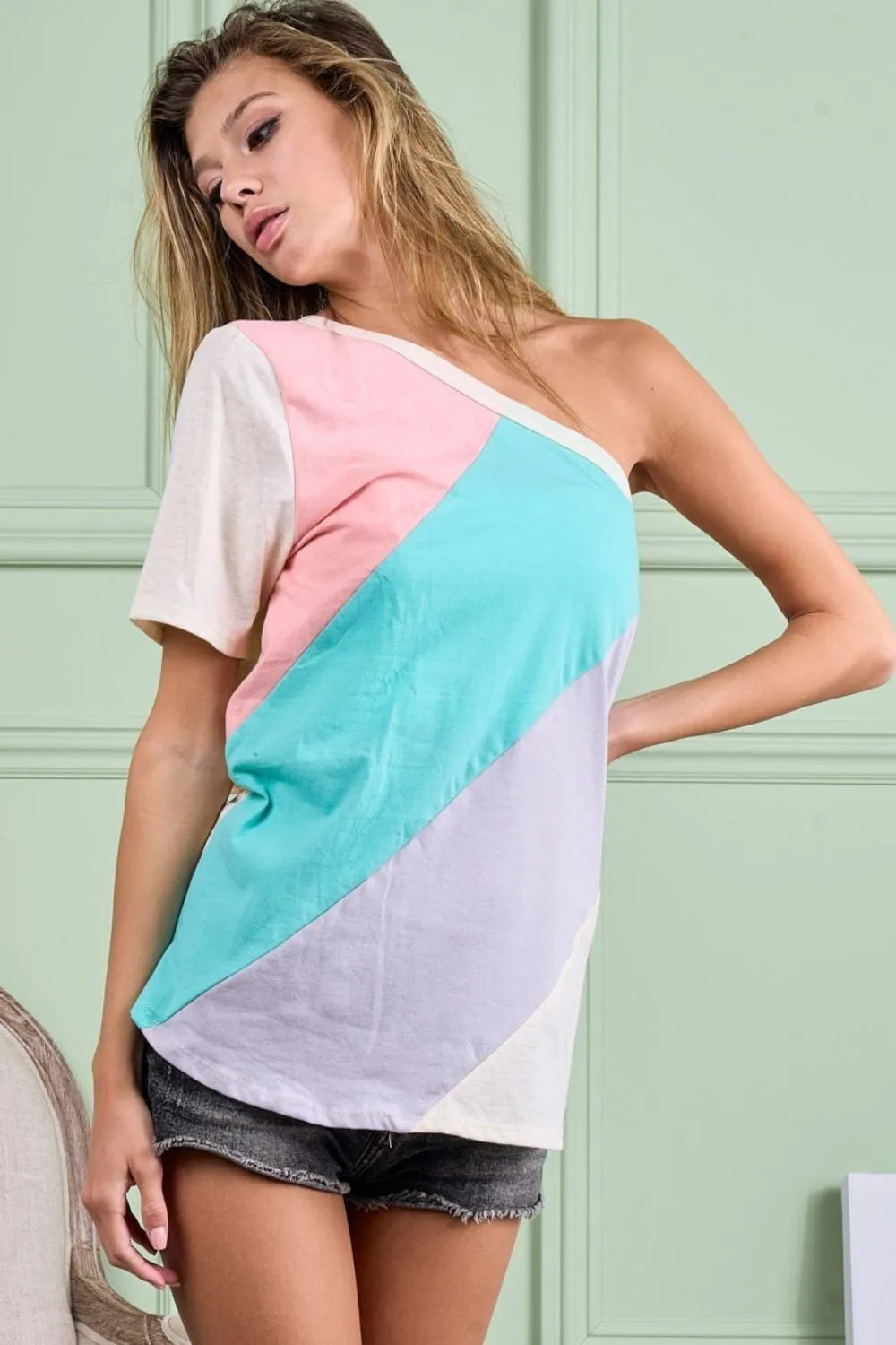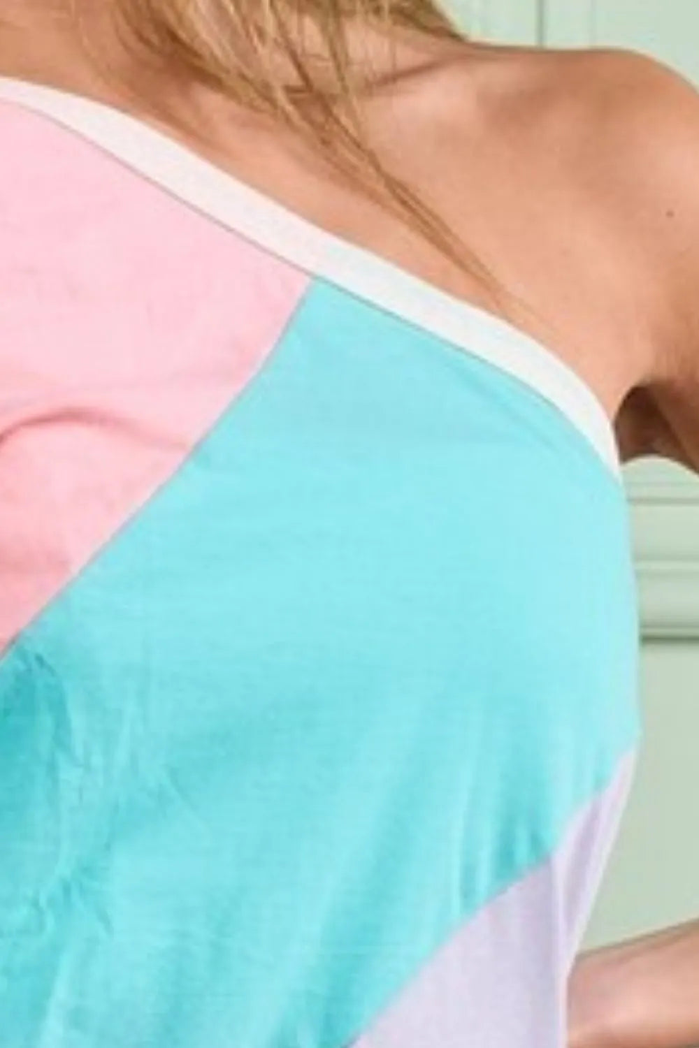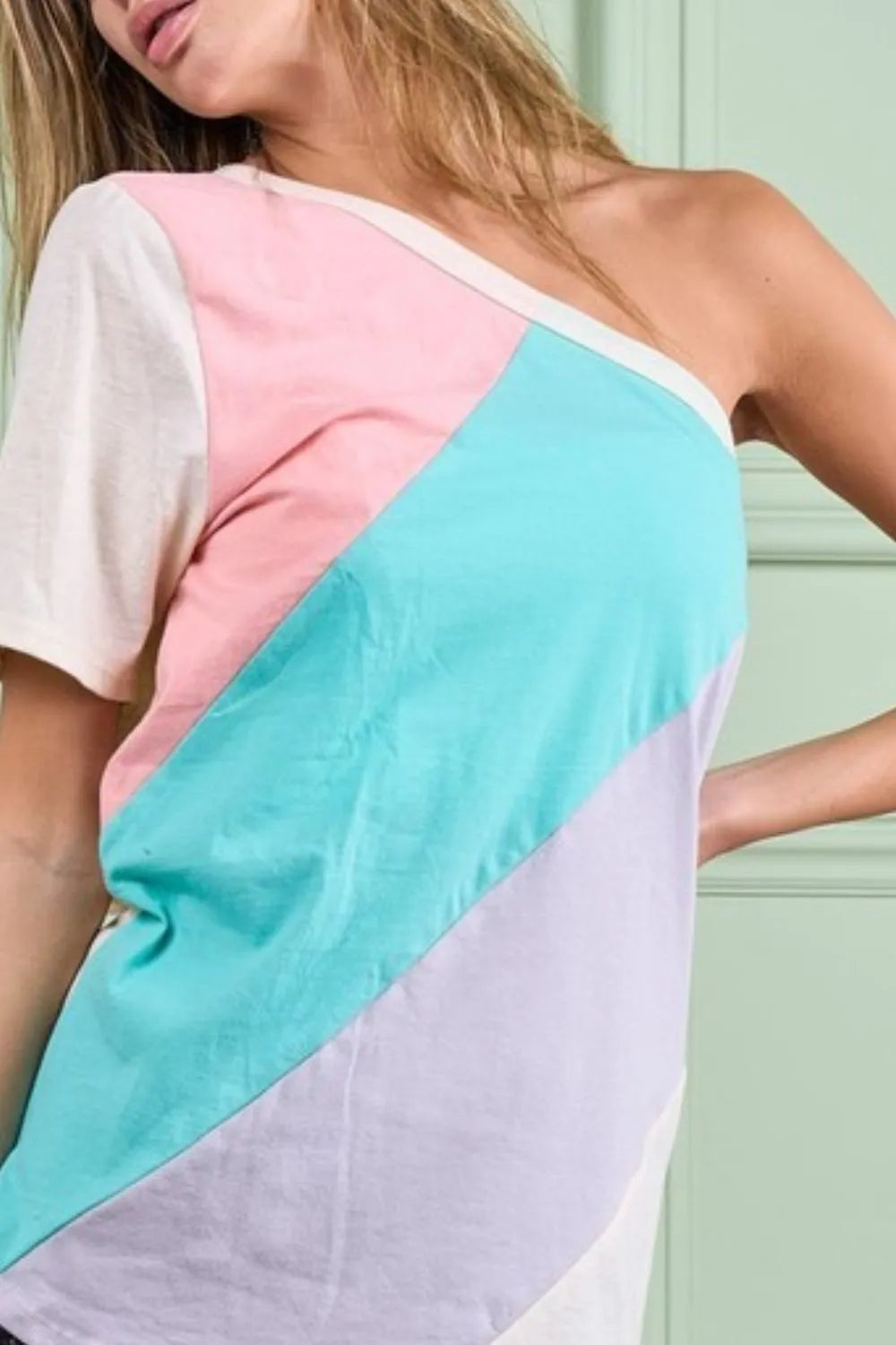 This one-shoulder top is made of cotton and features a color block design for a stylish and modern look. The one-shoulder style adds a touch of sophistication and allure to the top. The color block detailing creates a visually interesting and trendy aesthetic. Made with breathable cotton fabric, this top offers both comfort and style. Elevate your wardrobe with this chic and versatile top that effortlessly combines comfort and fashion-forward design for a standout outfit.
