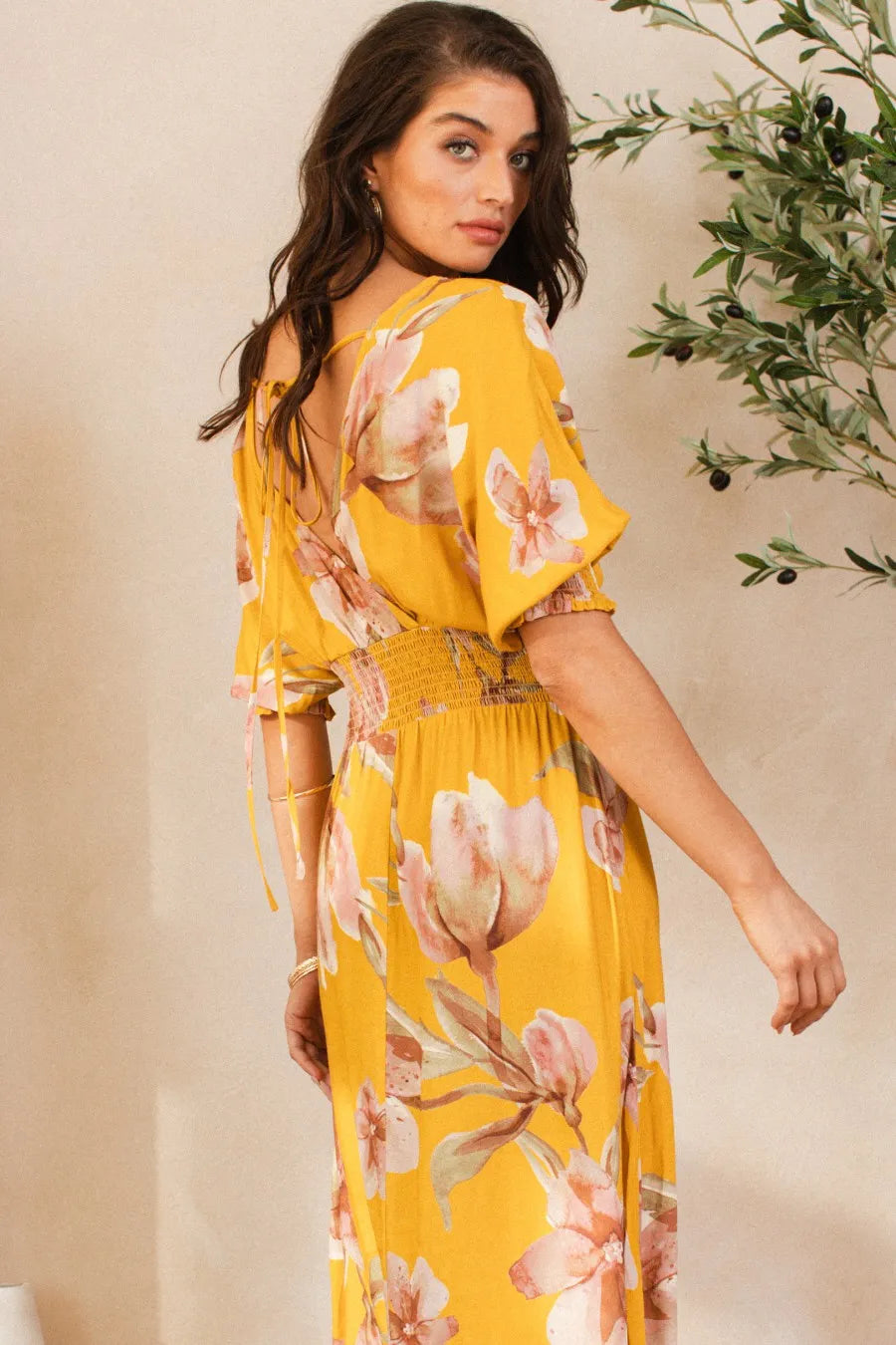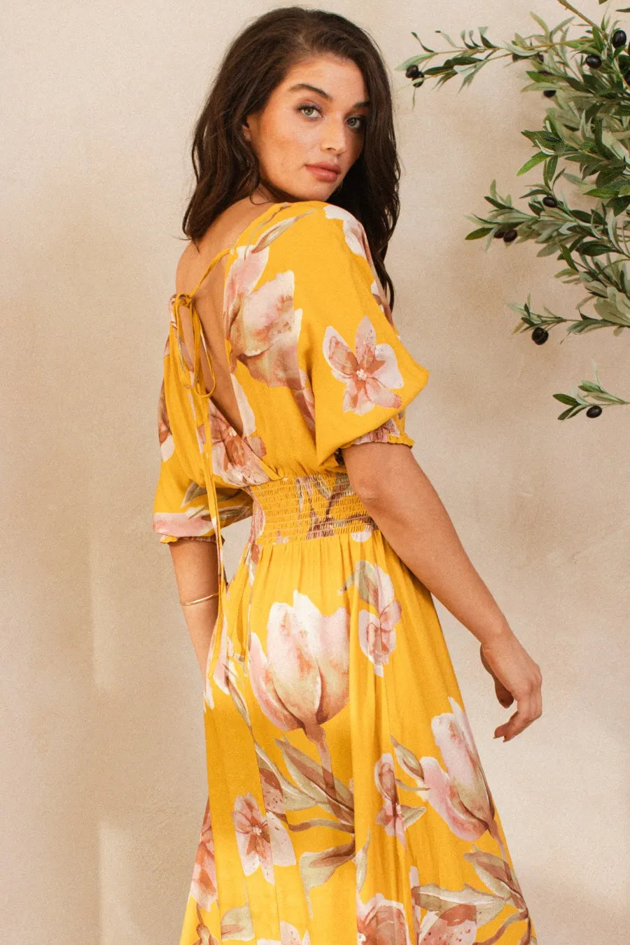 A floral print open tie back maxi dress is a stylish and feminine choice for various occasions. This dress typically features a long length, flowing silhouette, and a floral print design, which adds a touch of elegance and romance. The open tie back detail at the back of the dress adds a flirty and playful element to the overall look. This style is perfect for summer events, beach outings, or garden parties. You can pair it with sandals or wedges and accessorize with delicate jewelry to complete the outfit.