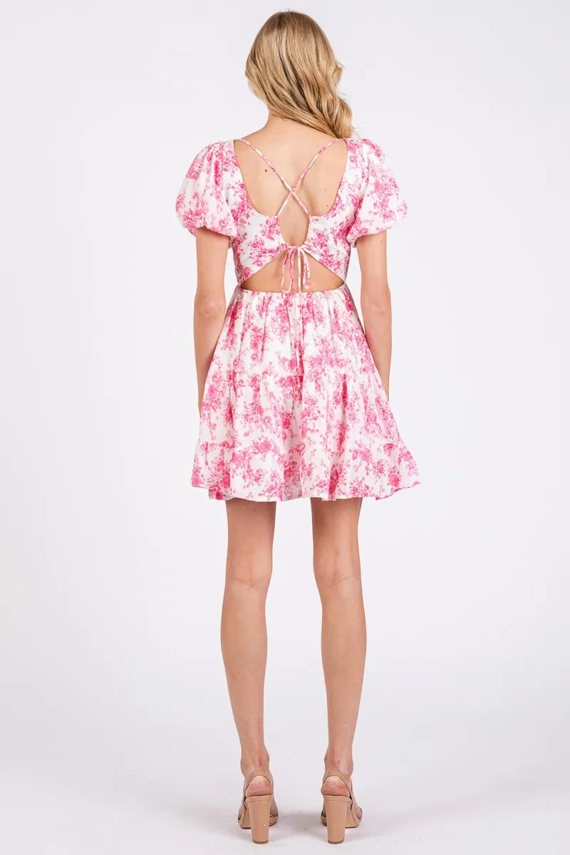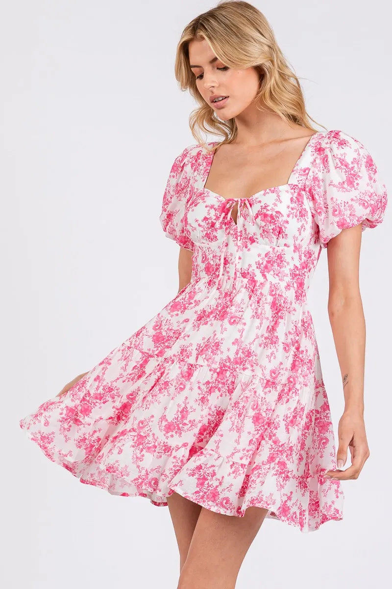 BiBi Flower Print Crinkle Gauze Puff Short Sleeve Dress