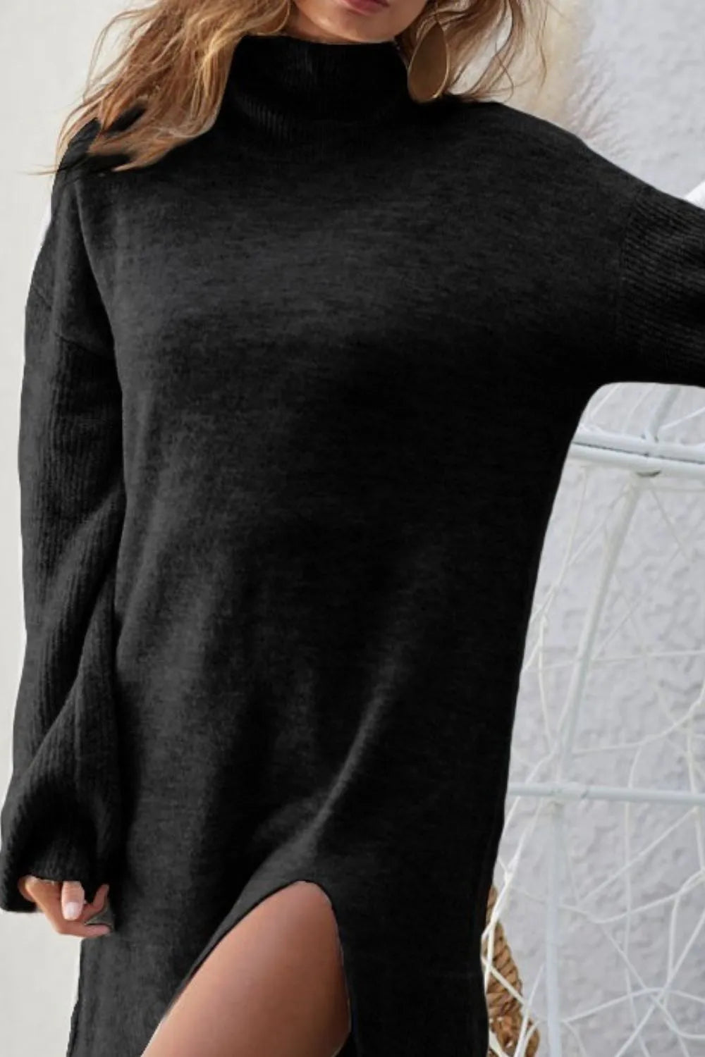 A high neck sweater dress with a slit is a stylish and versatile piece for the cooler months. The high neck adds a touch of sophistication, while the slit adds a hint of femininity and some movement to the outfit. This combination can be great for more formal occasions or a chic winter look. You can pair it with some ankle boots or heels and accessorize with statement jewelry or a belt to complete the look.