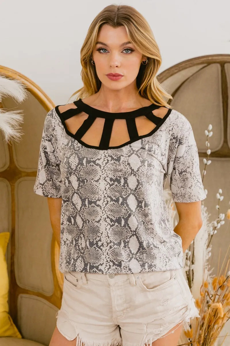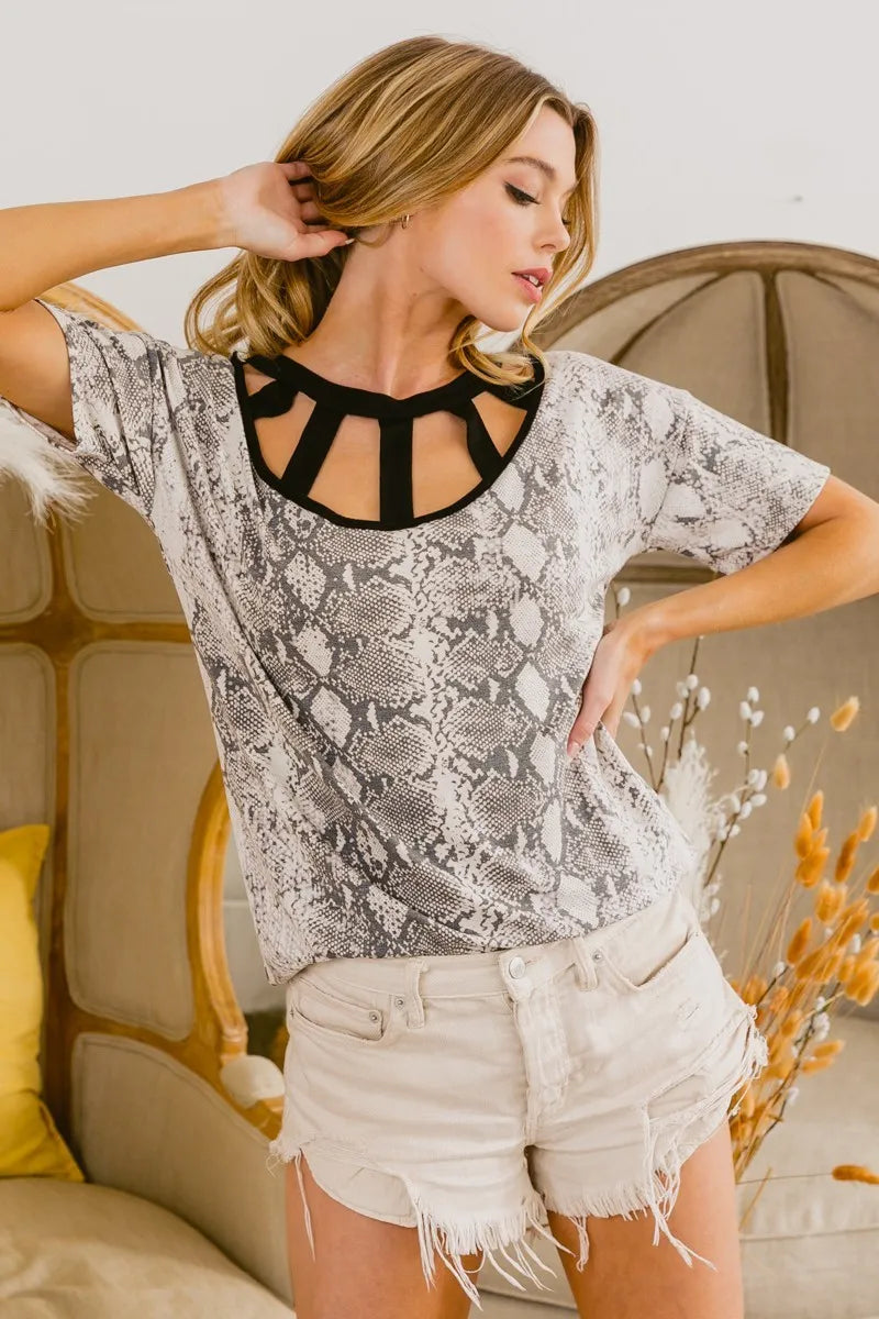 The snake skin print top with contrast caged neck is a bold and edgy addition to your wardrobe. The snake skin print adds a trendy and fierce touch to this top. The contrast caged neck detailing enhances its unique design and adds a touch of attitude. Pair it with jeans or leather pants for a stylish and statement-making outfit. Embrace the daring and fashion-forward style of this snake skin print top with contrast caged neck for a striking and modern look.