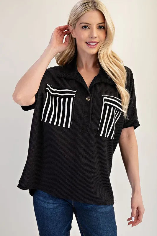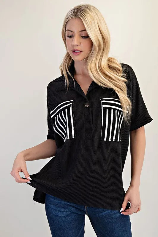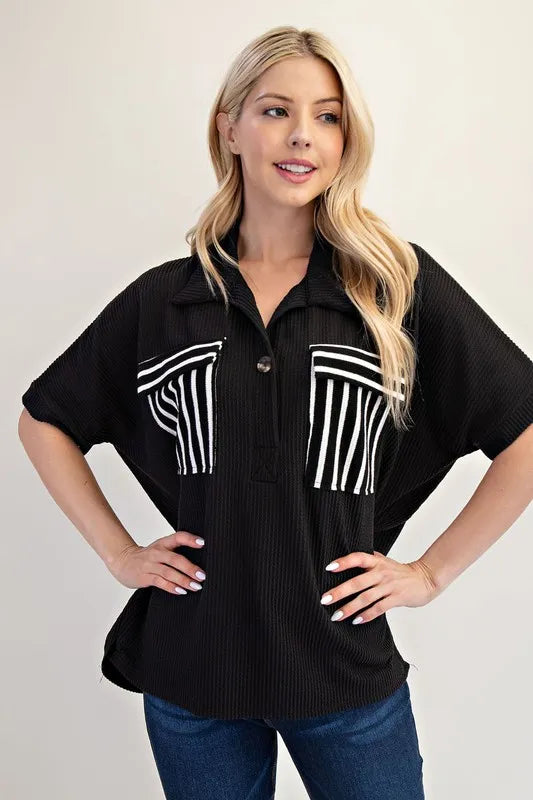 Add a touch of sophistication to your outfit with this Rib Knit Collared Top featuring stylish Striped Pockets. The ribbed knit fabric gives a cozy and comfortable feel, while the collared neckline adds a polished look. The striped pockets provide a trendy pop of pattern and contrast. This top is versatile and perfect for both casual and office wear. Pair it with your favorite pants or skirt for a chic and effortlessly put-together look.