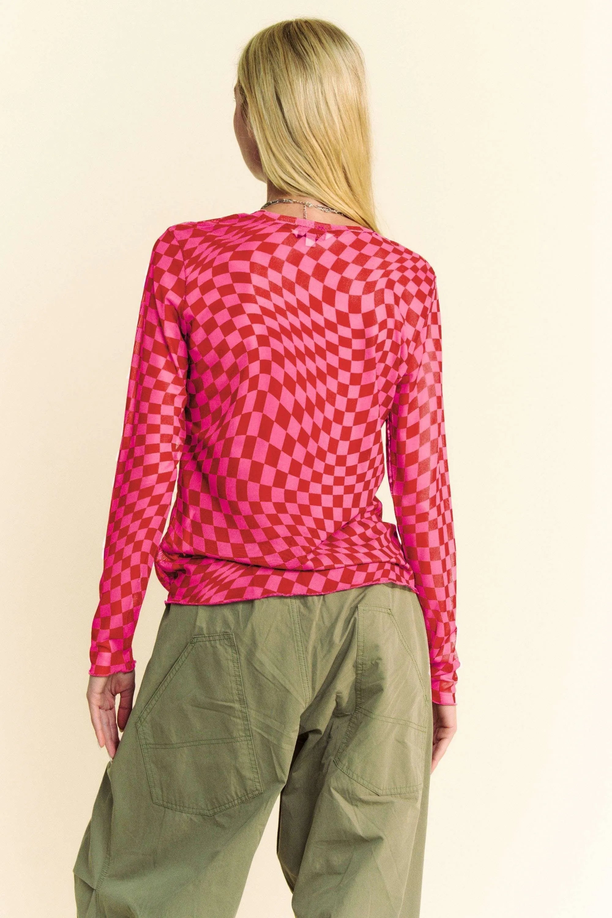 Davi & Dani Checker Board Mesh Long Sleeve Layering Top