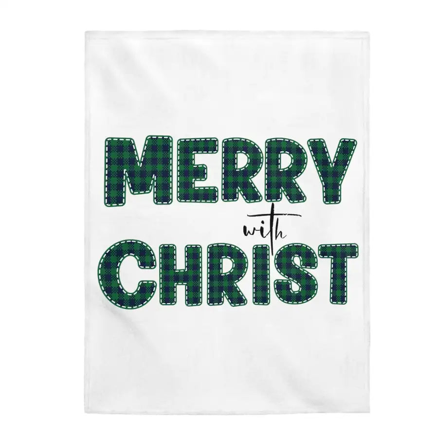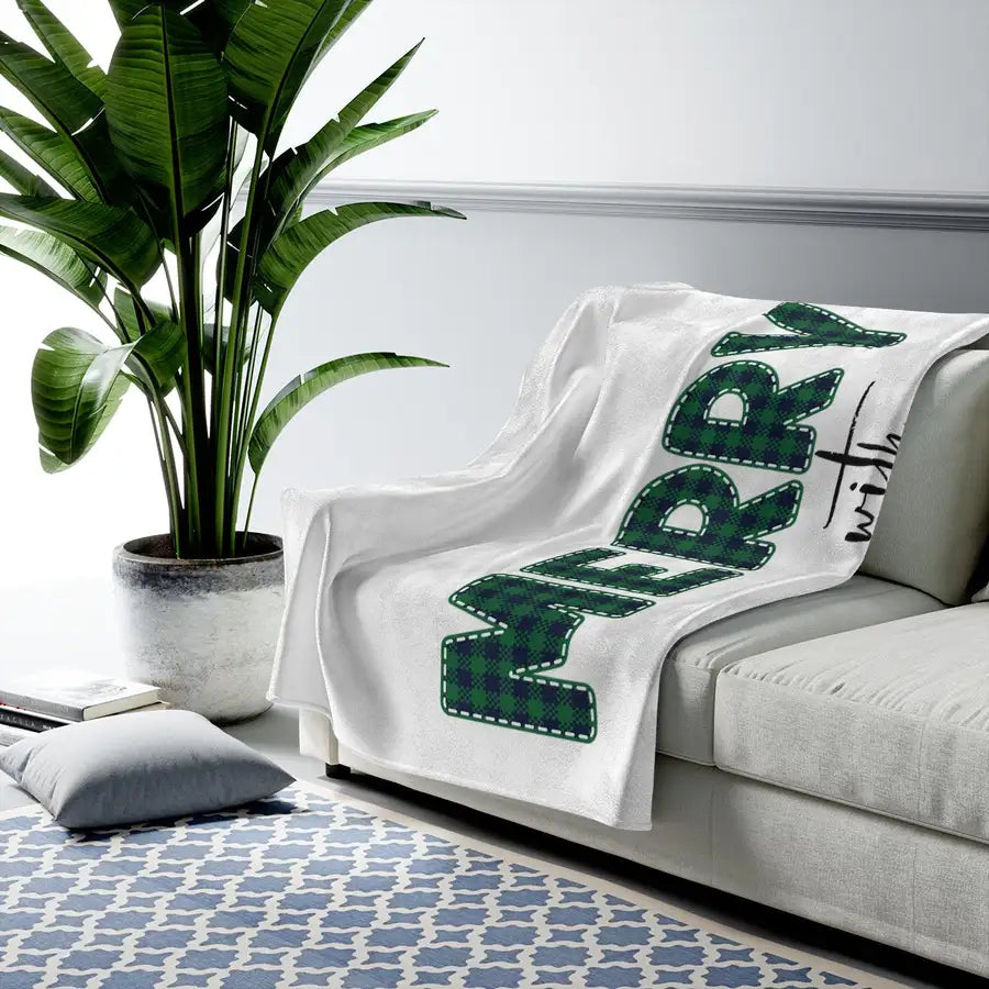 Home Decor, Throw Blanket Sofa/Bedding/Travel, Merry With Christ, Green Plaid Christmas Holiday Pattern Print