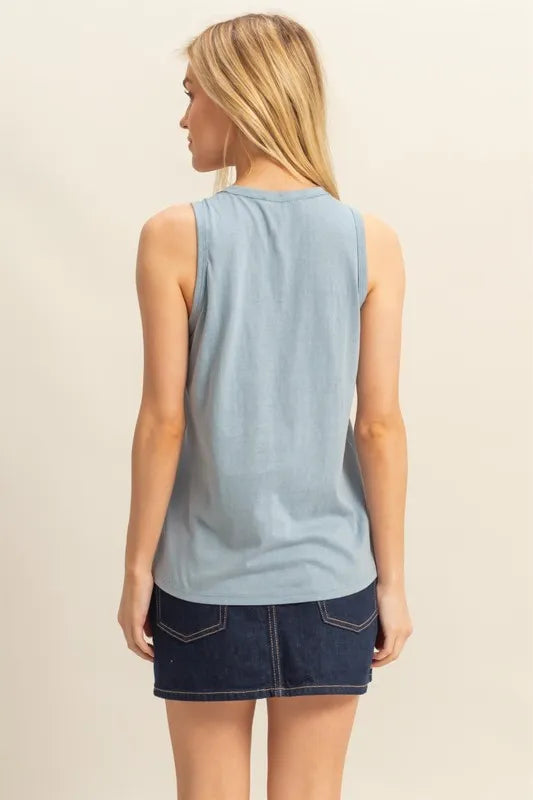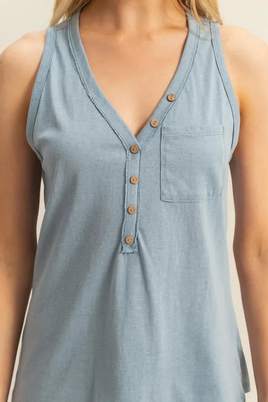 Stay cool and stylish in this Slub Knit Half Button Sleeveless Top. The slub knit fabric adds texture and interest, perfect for a casual yet elevated look. The half-button front detail offers a touch of sophistication, while the sleeveless design keeps you comfortable on warm days. Pair this versatile top with shorts or jeans for a chic and effortless outfit. Embrace a relaxed and fashionable style with this sleeveless top that's perfect for any occasion.