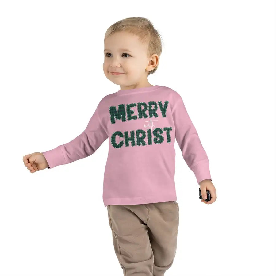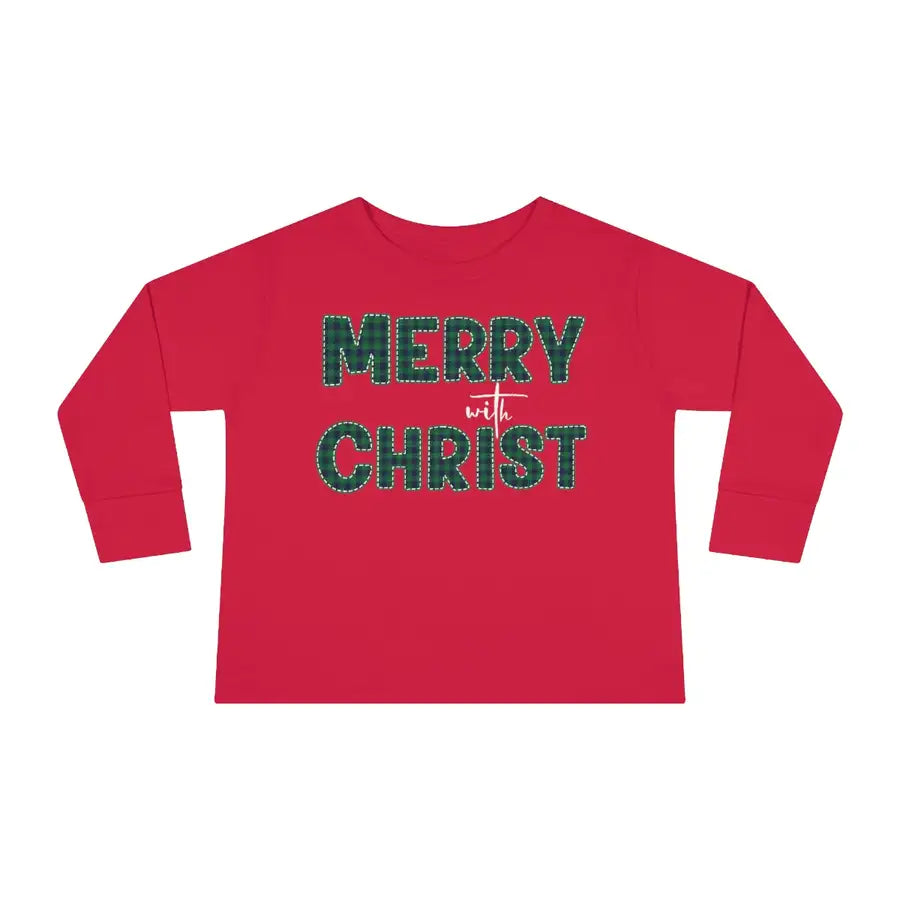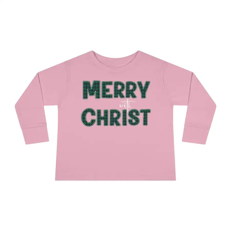 Long Sleeve Graphic T-Shirt for Toddlers, Merry With Christ, Green Plaid Christmas Holiday Pattern Print