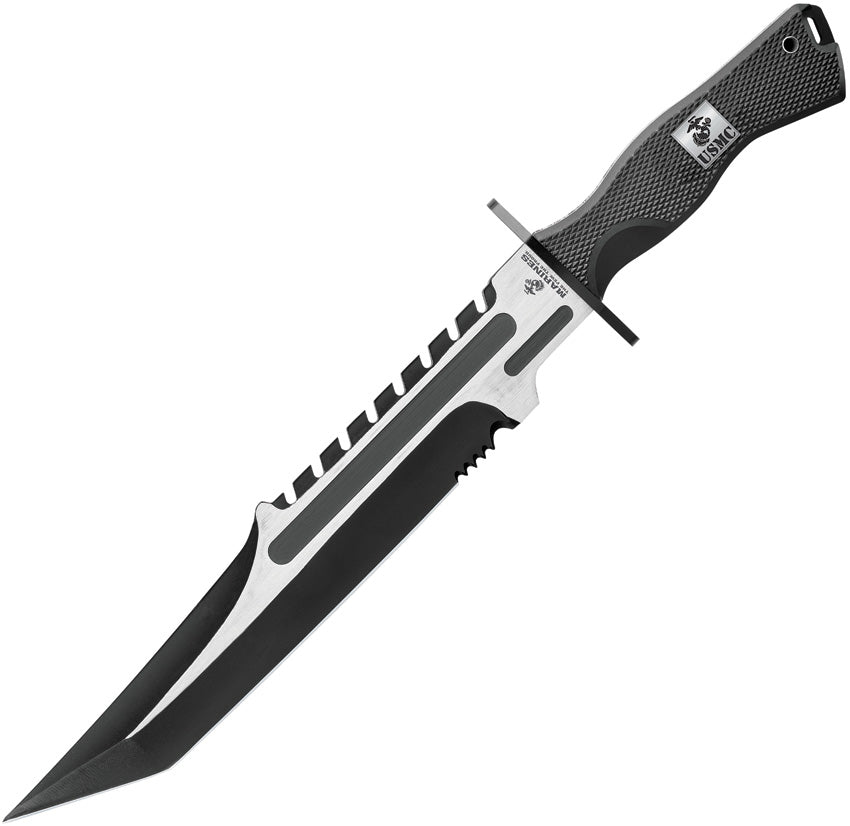 16.5" (41.91cm) overall. 10.75" (27.31cm) two-tone finish partially serrated stainless tanto blade. Black TPU handle. Steel guard. Lanyard hole. Sawback... Read more