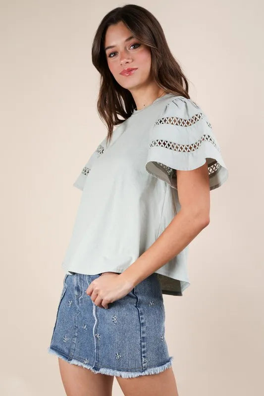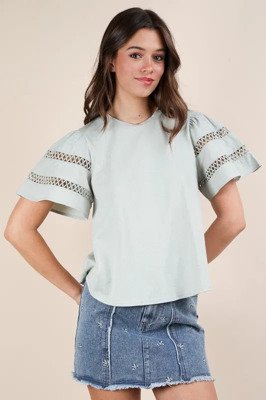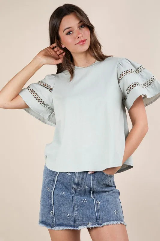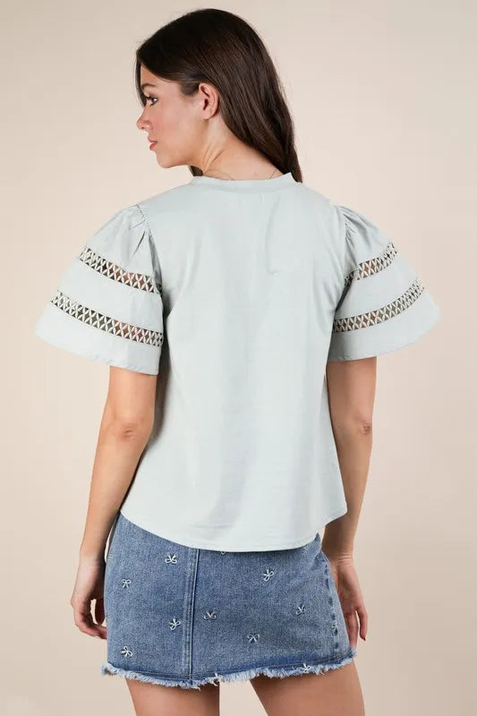 A lace trim sleeve top is a feminine and elegant piece that adds a touch of sophistication to any outfit. The delicate lace trim detailing on the sleeves gives the top a romantic and soft look, perfect for both casual and dressier occasions. This type of top can be styled in various ways - pair it with high-waisted jeans for a chic and casual look, or dress it up with a skirt or dress pants for a more polished ensemble. The lace trim adds a subtle and pretty detail to the top, making it a versatile and stylish addition to your wardrobe.