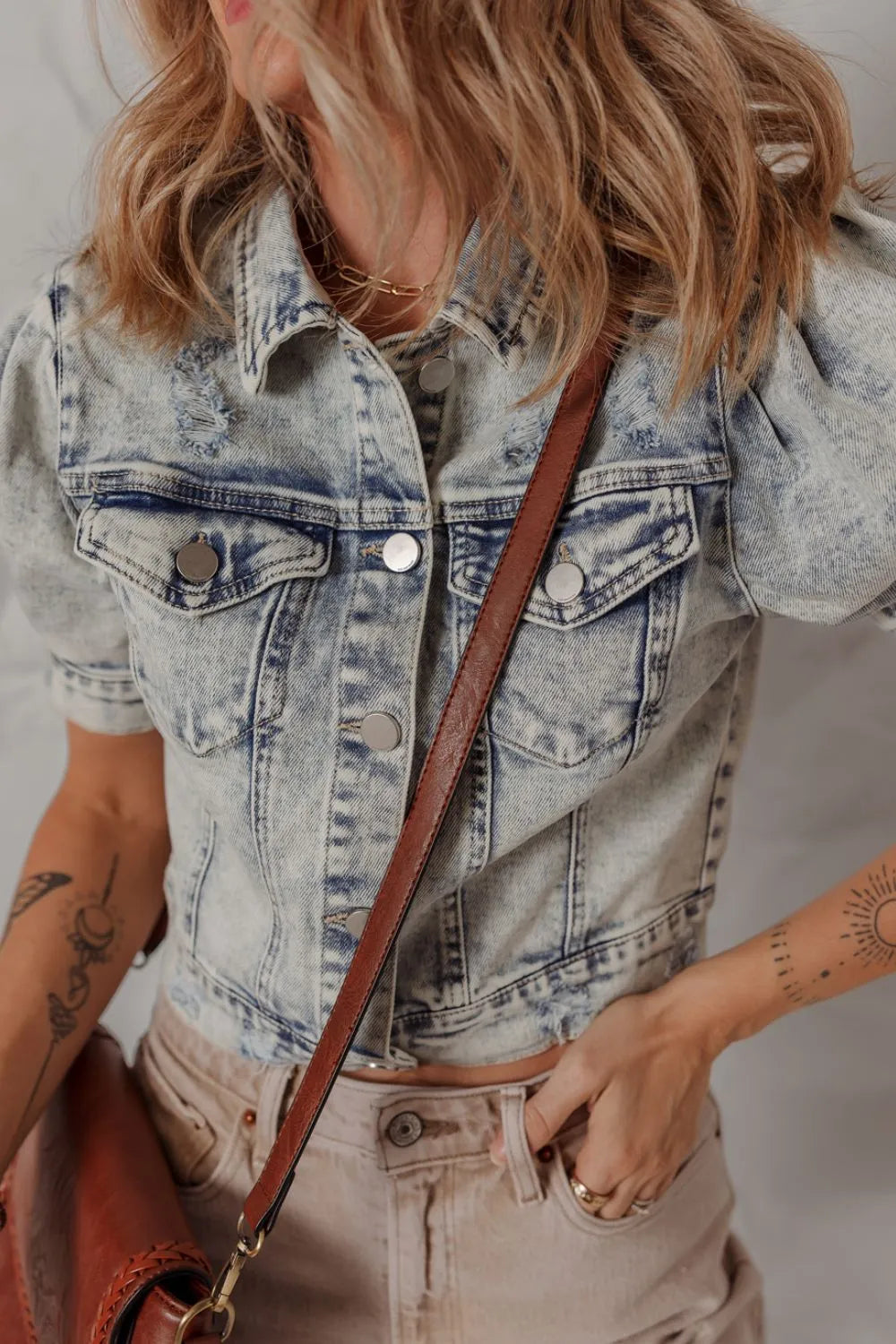 Wash Buttoned Chest Pocket Puff Sleeve Denim Jacket