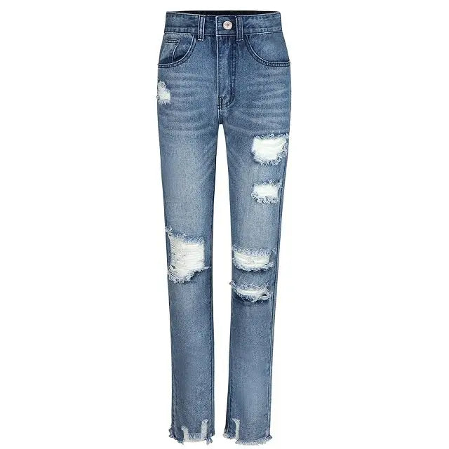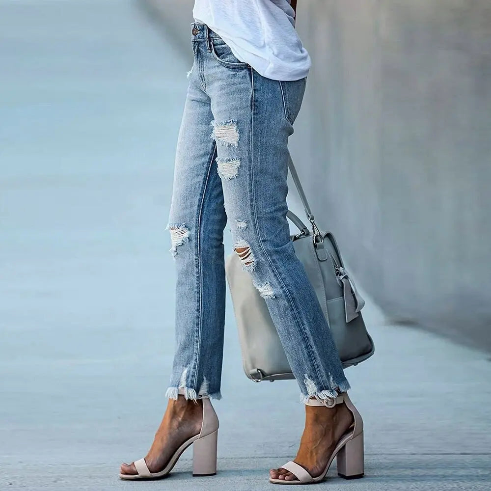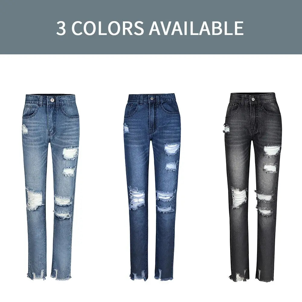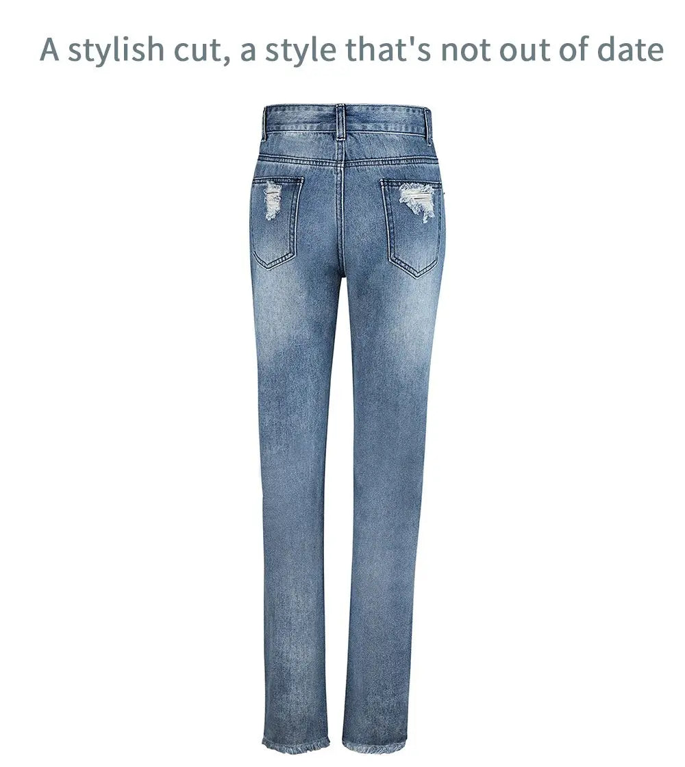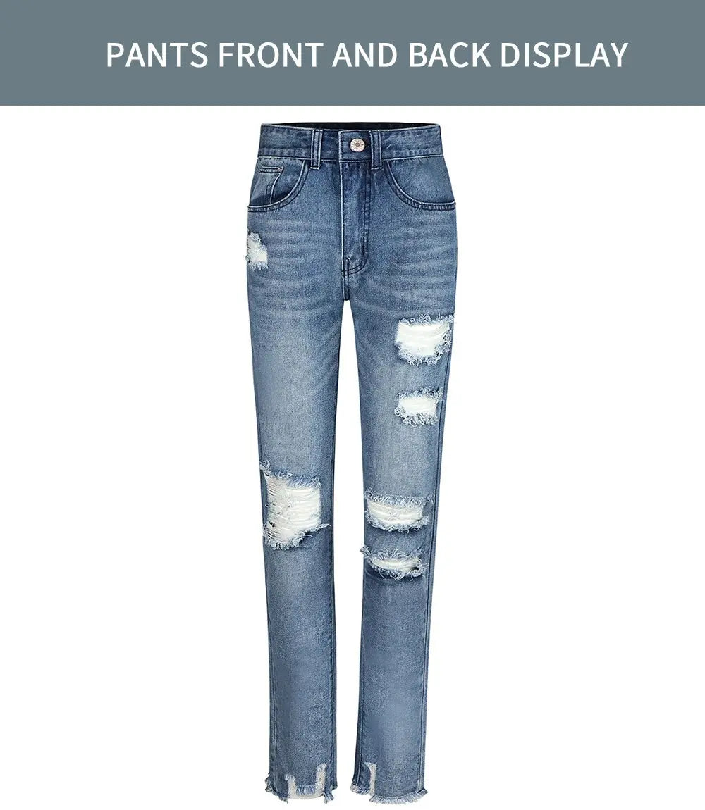 Product Information: Women's Ripped Boyfriend Slim Fit Jeans Frayed Distressed Stretchy Denim Pants Casual Fashion Stretch Blue Jeans. Material: Cotton, polyester, soft, lightweight, elastic, breathable and durable.