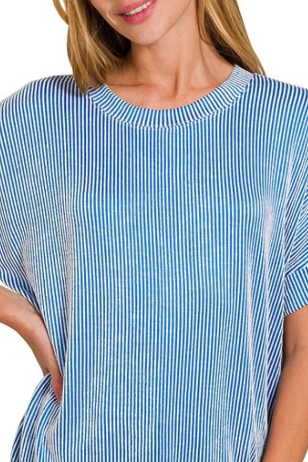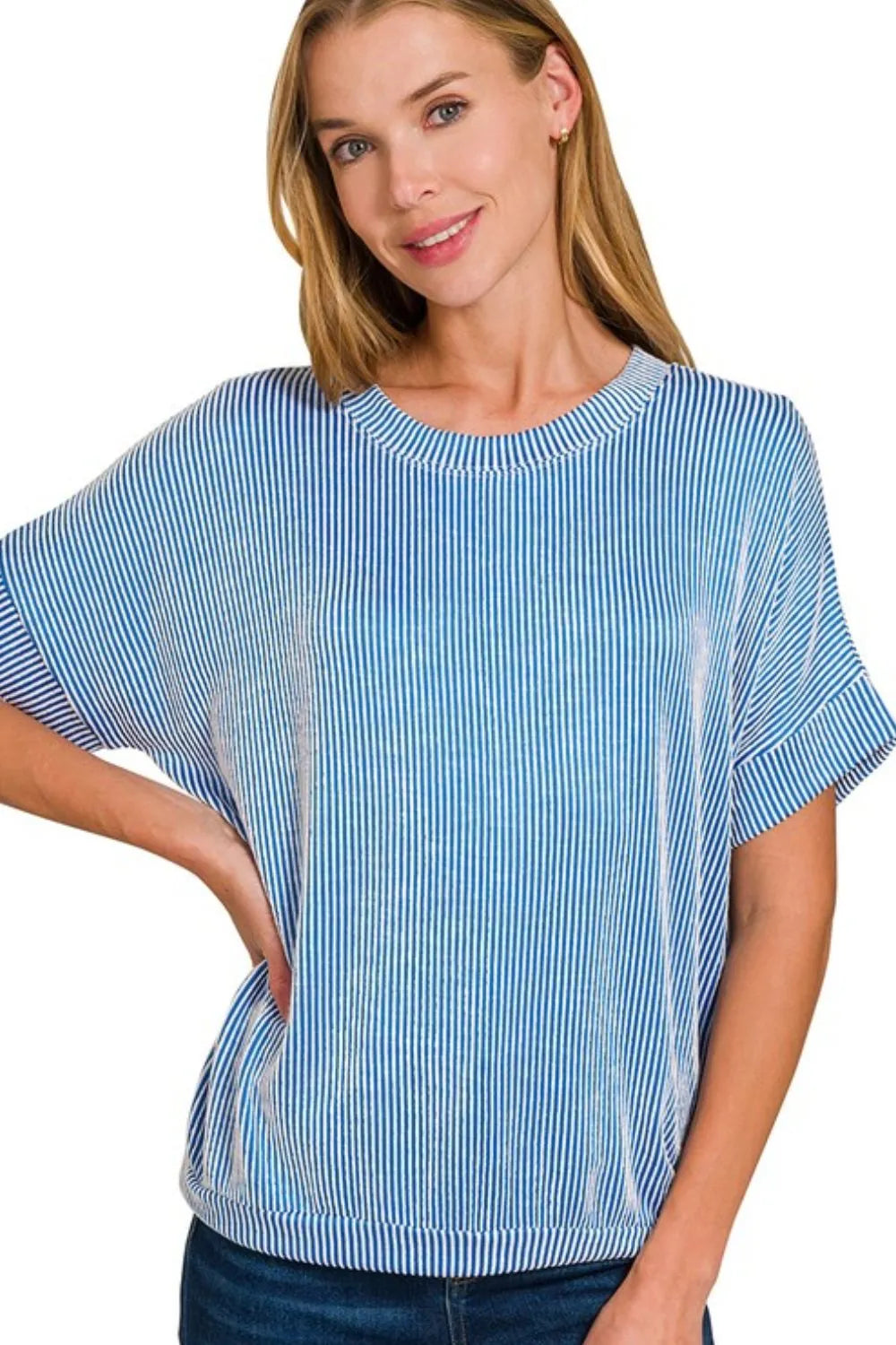 A Corded Rib Short Sleeve T-Shirt is a versatile and stylish top that features a textured corded ribbed fabric and short sleeves. The corded rib detailing adds visual interest and dimension to the t-shirt, creating a unique and trendy look. The short sleeves provide a casual and comfortable fit, making it suitable for everyday wear. This t-shirt can be dressed up with a skirt or trousers for a more polished outfit or paired with jeans for a relaxed and laid-back vibe. The Corded Rib Short Sleeve T-Shirt is a chic and versatile wardrobe staple that can be easily dressed up or down for various occasions.