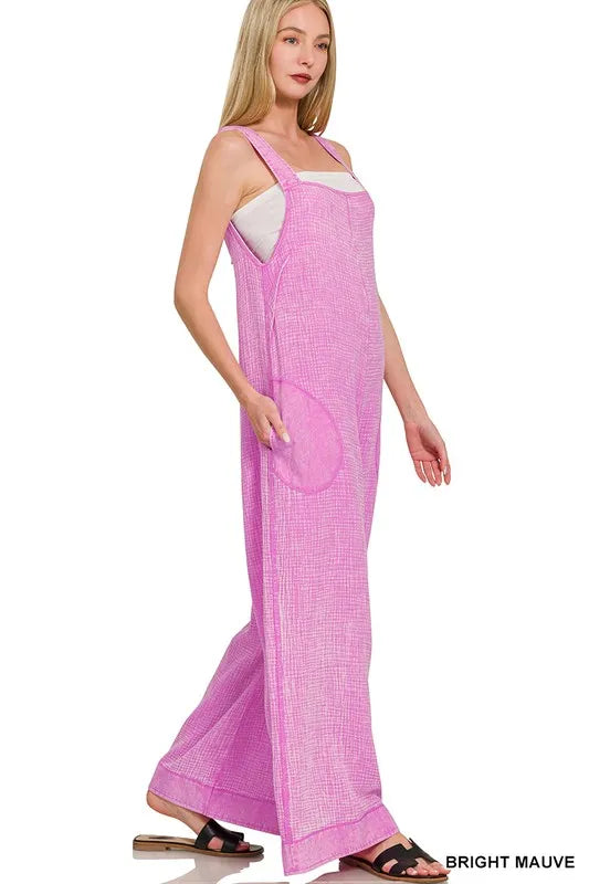Double gauze washed wide leg overalls are a stylish and comfortable clothing option that combines a trendy silhouette with a soft and breathable fabric. The double gauze material has a lightweight and airy feel, making it perfect for warmer weather. The washed finish gives the overalls a relaxed and slightly worn-in look that adds to their charm. The wide leg design adds a fashionable touch, and the overalls can be styled in various ways for a casual and chic outfit. Pair them with a simple t-shirt or tank top underneath and accessorize with sneakers or sandals for a laid-back and effortless look. These overalls are versatile and can be worn for various occasions, from running errands to a casual day out with friends.