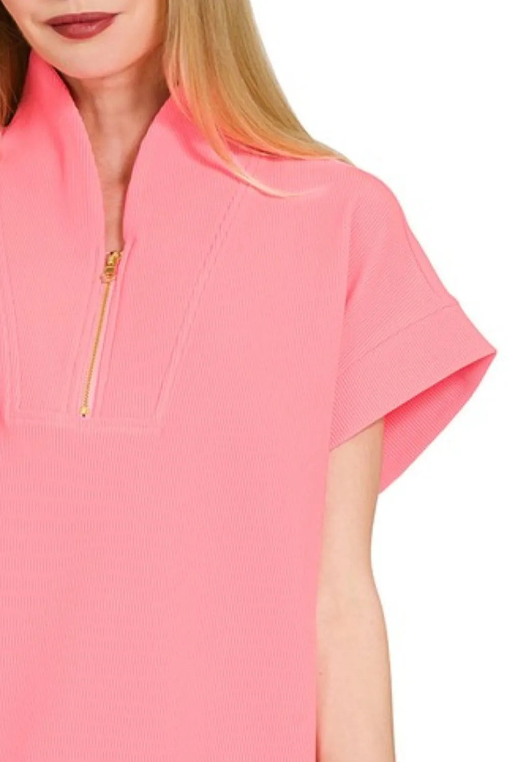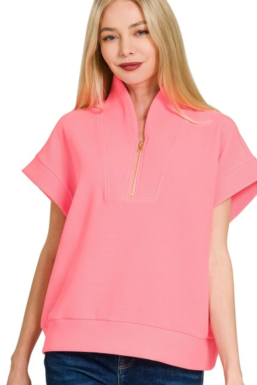 The Ribbed High Neck Half Zip Top is a trendy and versatile piece that offers both style and functionality. The high neck provides added warmth and a chic silhouette, while the half zip detail adds a sporty touch. The ribbed texture gives the top a modern and sophisticated look, making it easy to dress up or down. This top is perfect for layering under jackets or wearing on its own for a sleek and stylish outfit. Whether you're heading to work or running errands, this top is a versatile and fashionable choice.