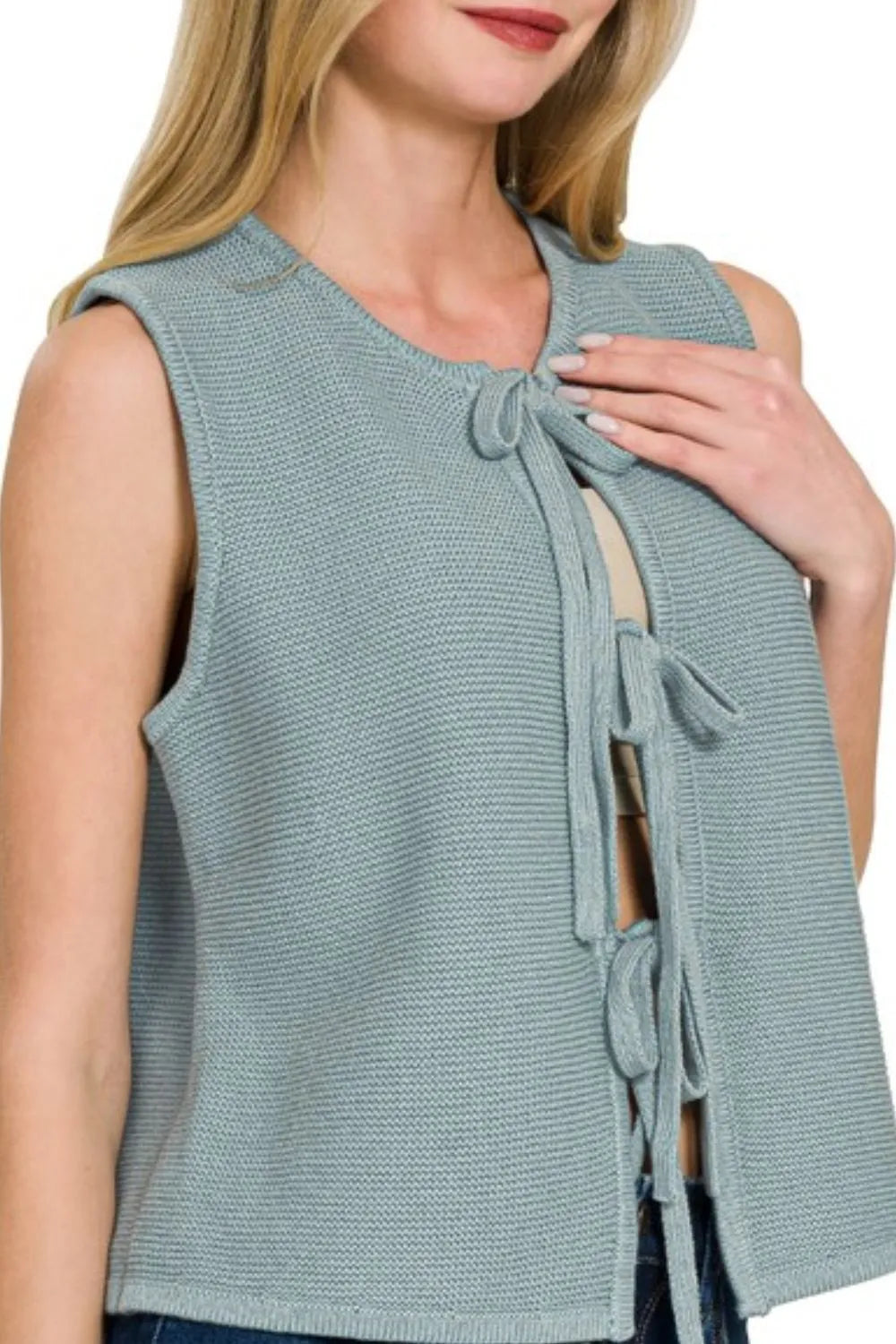 A Tie Front Sweater Vest is a stylish and versatile wardrobe piece that combines the warmth of a sweater with the trendiness of a vest. This garment typically features a sleeveless design with a tie front closure, allowing you to adjust the fit and style to your preference. The sweater material provides comfort and coziness, making it perfect for layering over tops or dresses in cooler weather. The tie front detail adds a touch of sophistication and can be styled in various ways, such as tied in a knot or bow. A Tie Front Sweater Vest is a chic and functional addition to your wardrobe, offering both style and versatility for creating fashionable outfits.