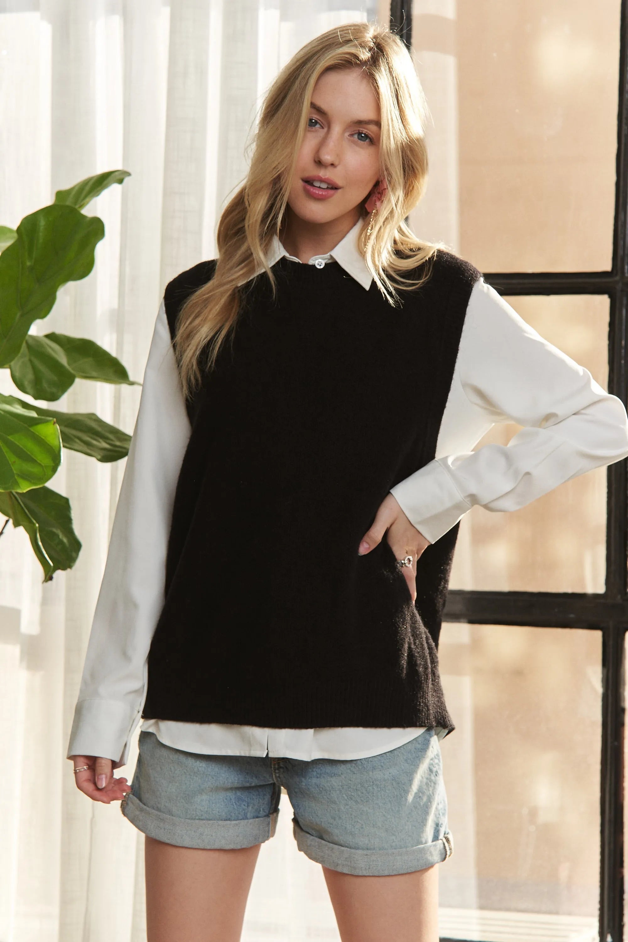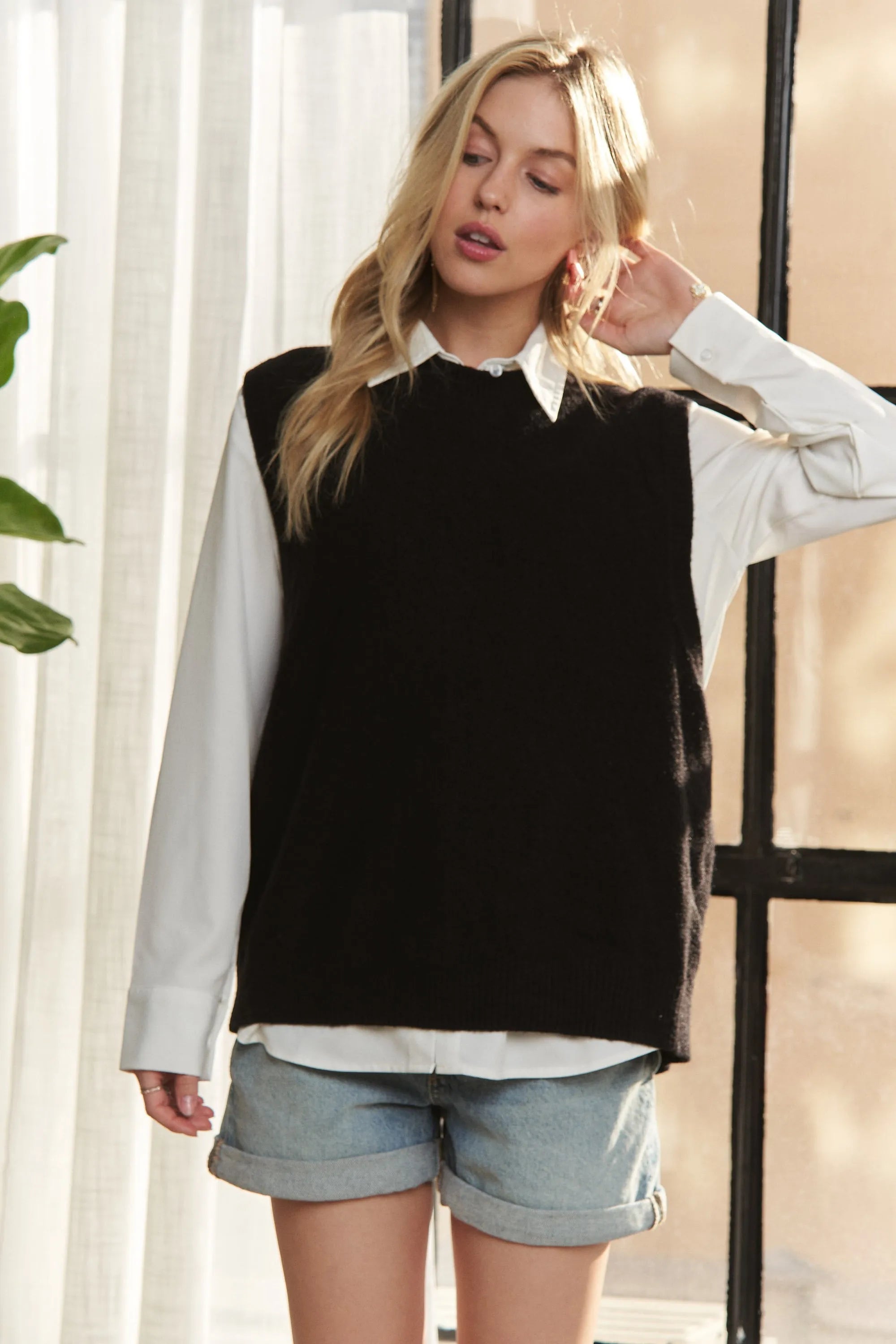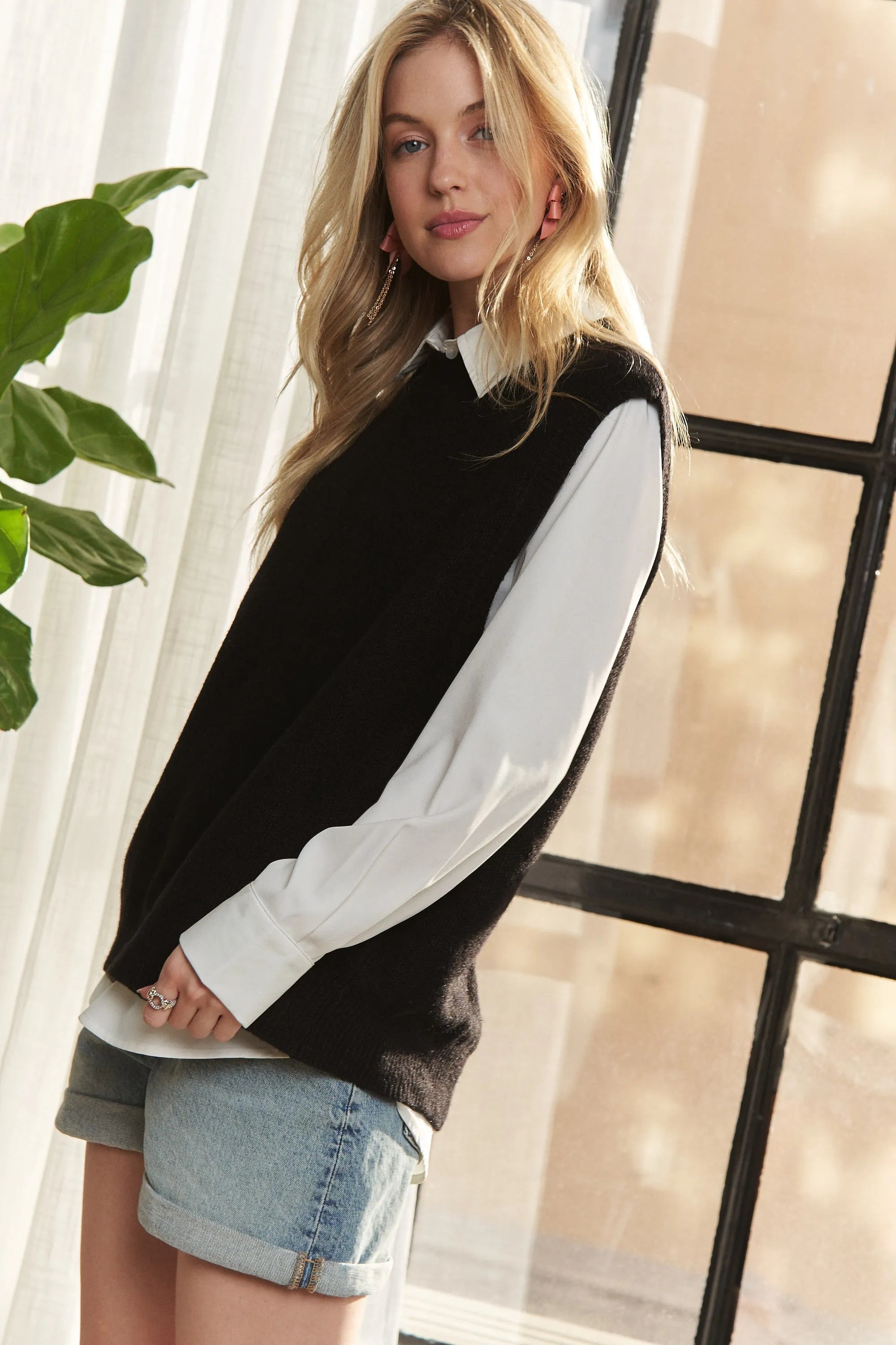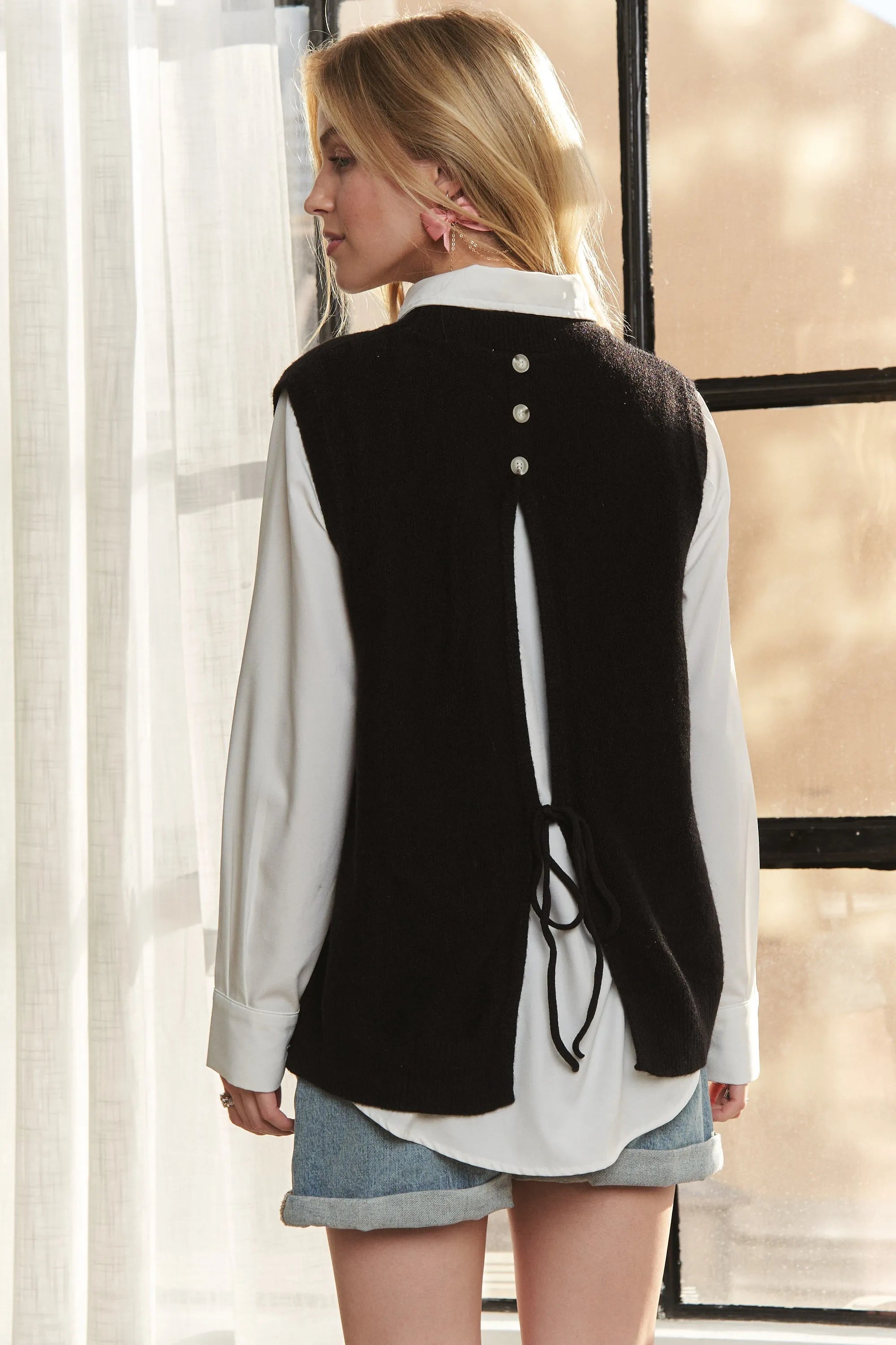 This round neck vest features a slight open back design for a stylish and contemporary look. The round neck offers a classic silhouette, while the slight open back adds a touch of intrigue and modernity to the garment. This design detail creates a subtle and sophisticated balance between coverage and a hint of skin. Perfect for layering over a contrasting top or under a structured jacket, this versatile vest can easily transition from casual to dressy occasions. Elevate your outfit with this chic and on-trend piece that effortlessly combines comfort with a touch of edgy style.