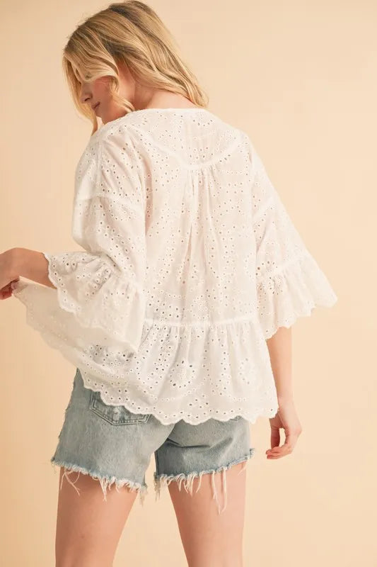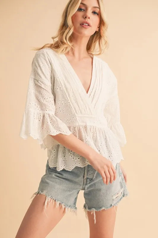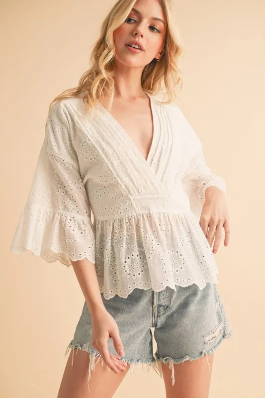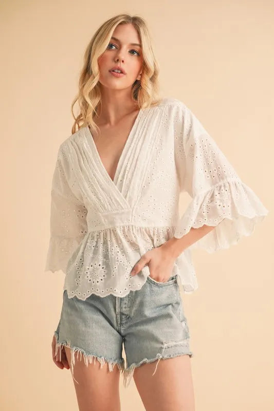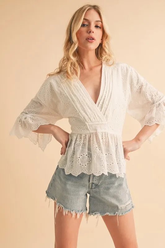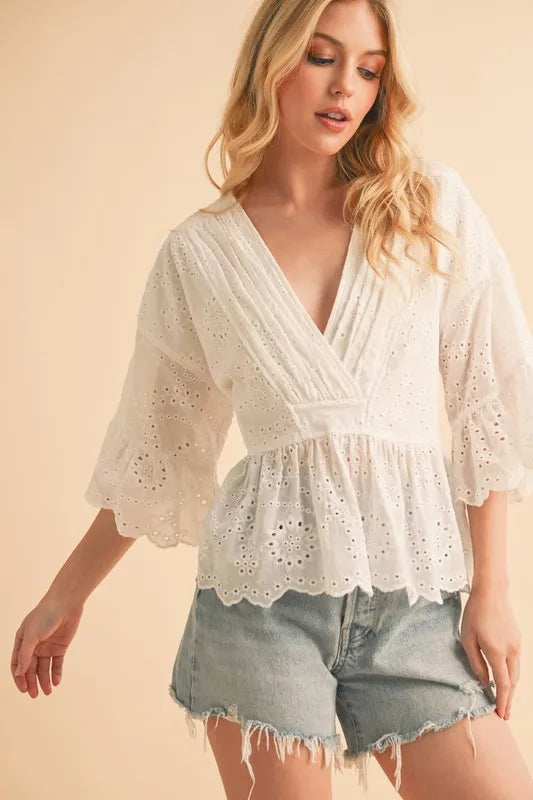 The flounce sleeve eyelet peplum top is a chic and stylish addition to your wardrobe. The flounce sleeves add a touch of drama and femininity to the top. The eyelet detailing adds a delicate and intricate touch, perfect for adding texture to your outfit. The peplum silhouette creates a flattering and defined waistline, adding a touch of elegance to your look. Pair this top with high-waisted pants or a skirt for a sophisticated and polished outfit.