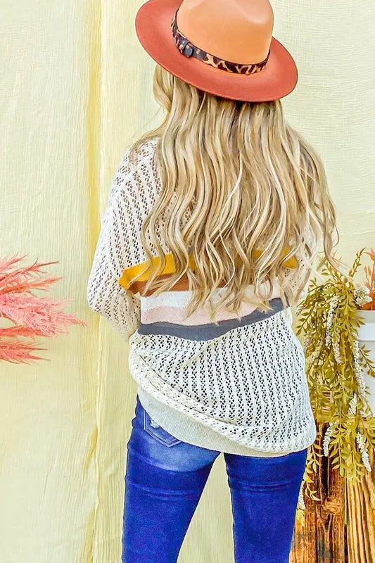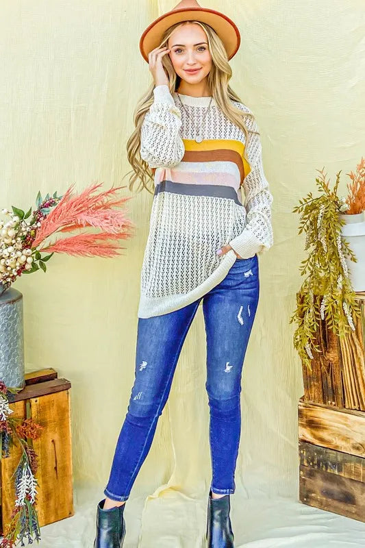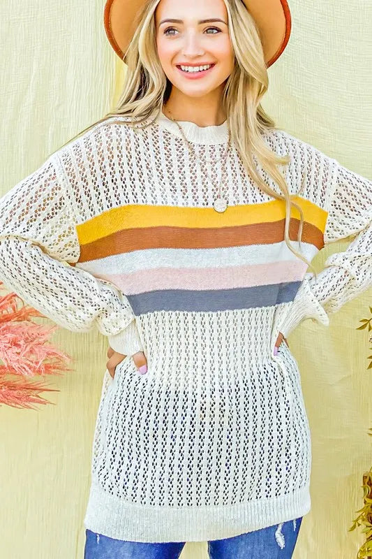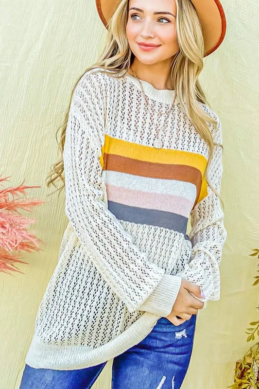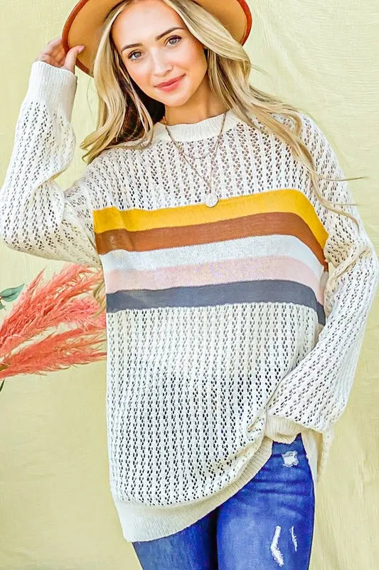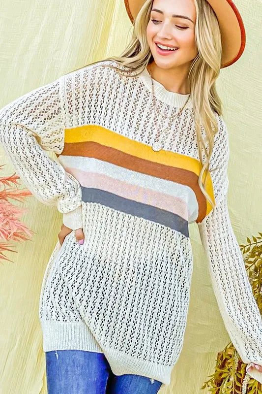 The color stripe summer sweater top is a vibrant and stylish option for the warmer months. Featuring colorful stripes, this top adds a playful and cheerful touch to your outfit. Perfect for summer days, you can pair this top with shorts, skirts, or jeans for a casual yet chic look. The lightweight knit fabric provides breathability and comfort in the heat. Whether you're headed to the beach or a casual outing, this colorful stripe sweater top is a versatile and on-trend choice for your summer wardrobe.