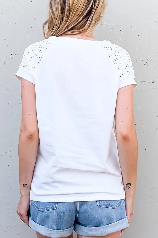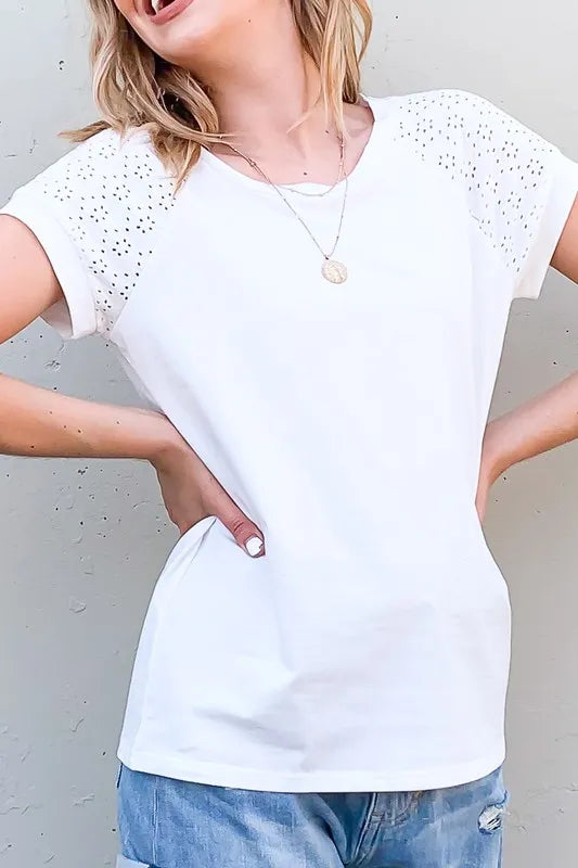 And The Why Eyelet Lace Shoulder Detail Short Sleeve Top