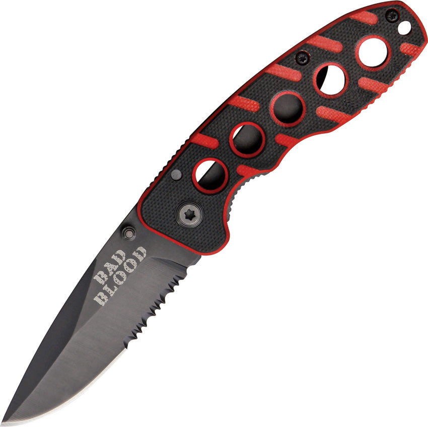 3 5/8" closed. 2 1/2" black finish stainless partially serrated blade. Black G-10 front handle with red stripes. Back handle... Read more