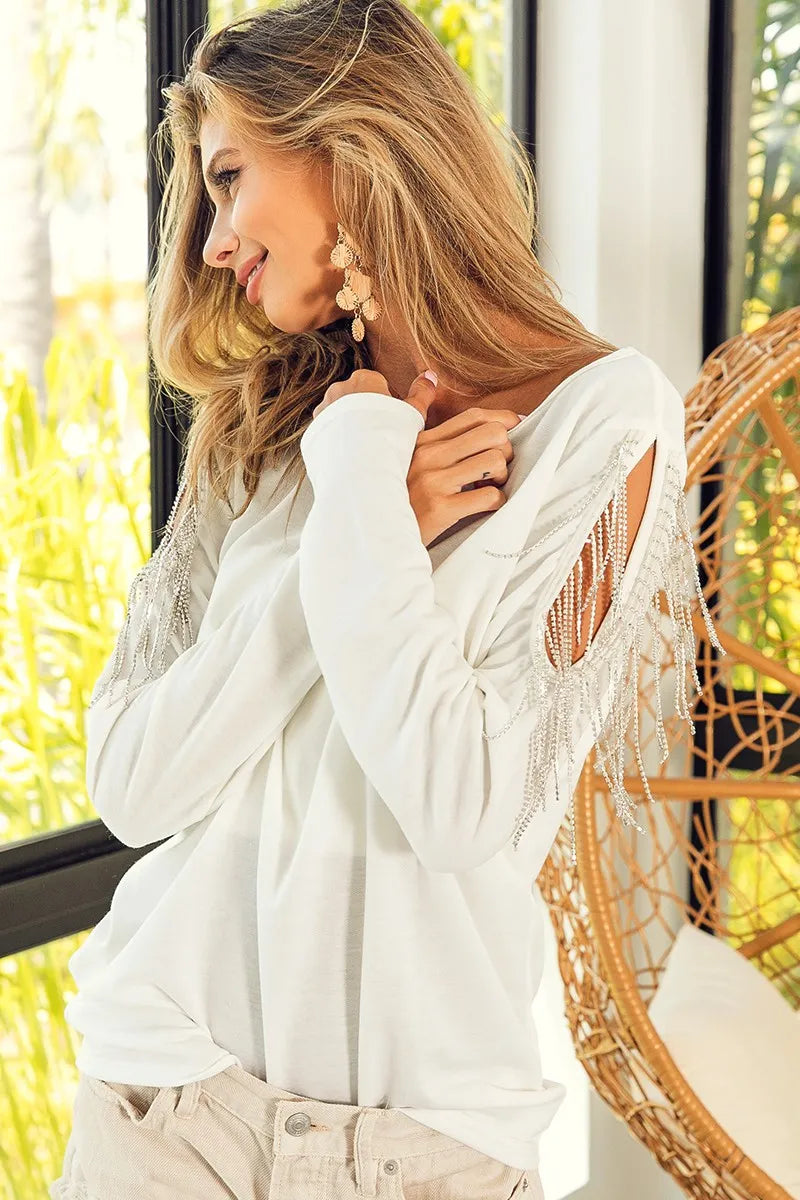 BiBi French Terry Cold Shoulder Ringstone Fringe Top