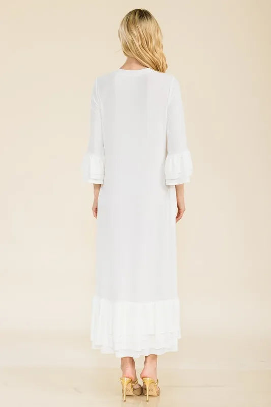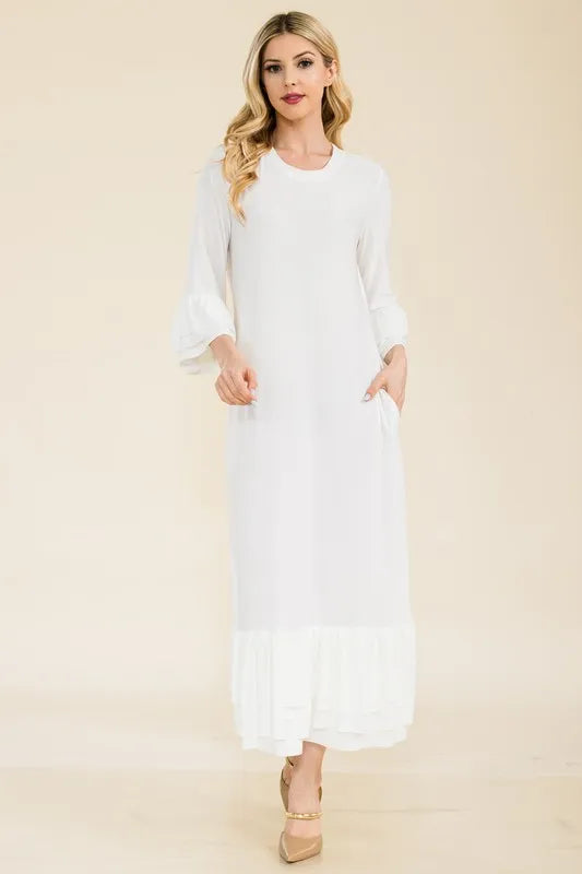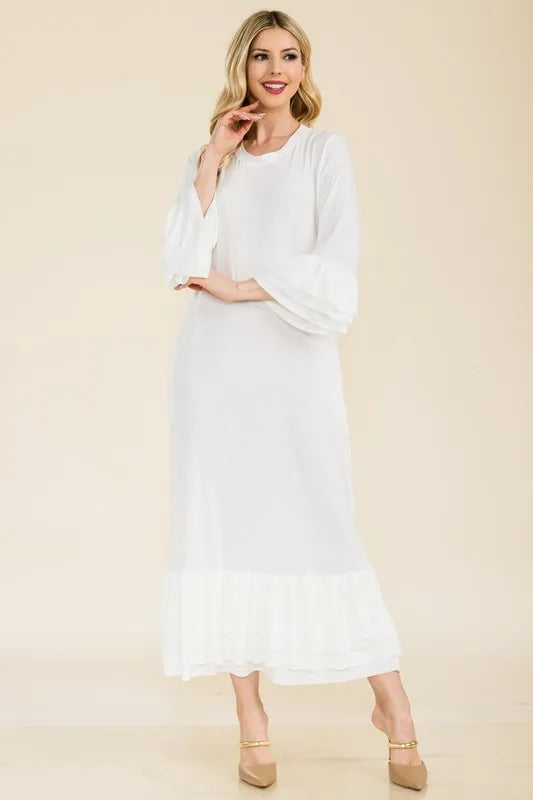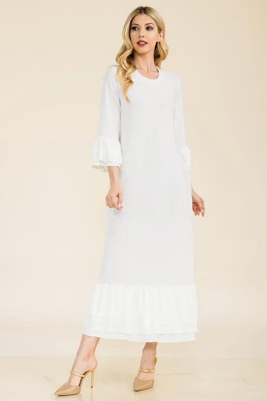 This modest midi dress with 3/4 ruffle bell sleeves is a sophisticated and stylish choice for various occasions. The midi length offers a classic and elegant silhouette. The 3/4 ruffle bell sleeves add a touch of femininity and charm to the dress. Perfect for both casual and dressy events, this dress is versatile and chic. Make a fashion statement with this lovely modest midi dress featuring 3/4 ruffle bell sleeves.