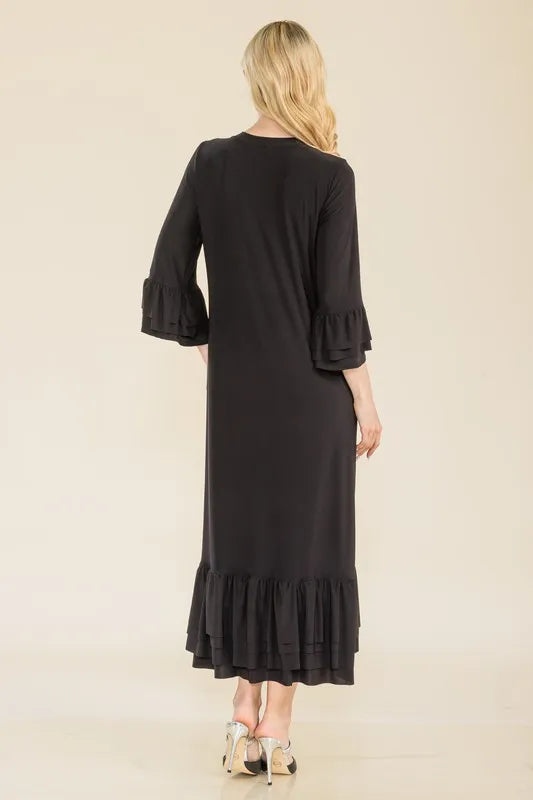 This modest midi dress with 3/4 ruffle bell sleeves is a sophisticated and stylish choice for various occasions. The midi length offers a classic and elegant silhouette. The 3/4 ruffle bell sleeves add a touch of femininity and charm to the dress. Perfect for both casual and dressy events, this dress is versatile and chic. Make a fashion statement with this lovely modest midi dress featuring 3/4 ruffle bell sleeves.