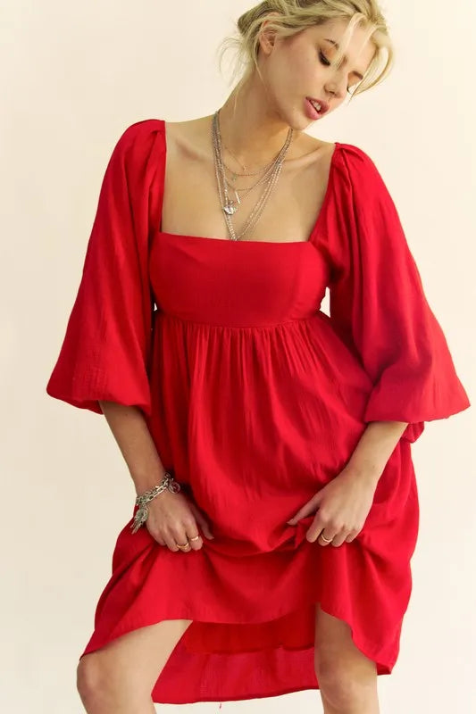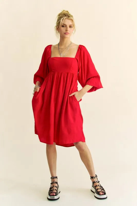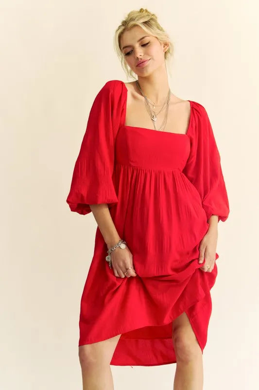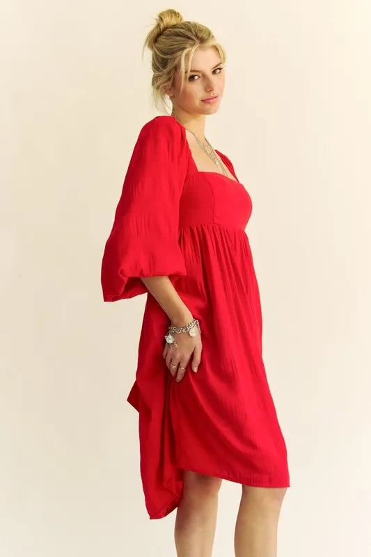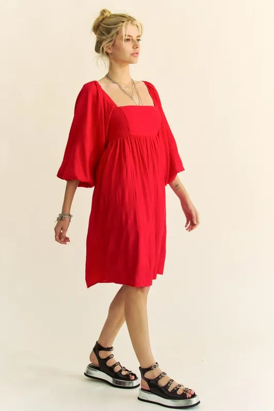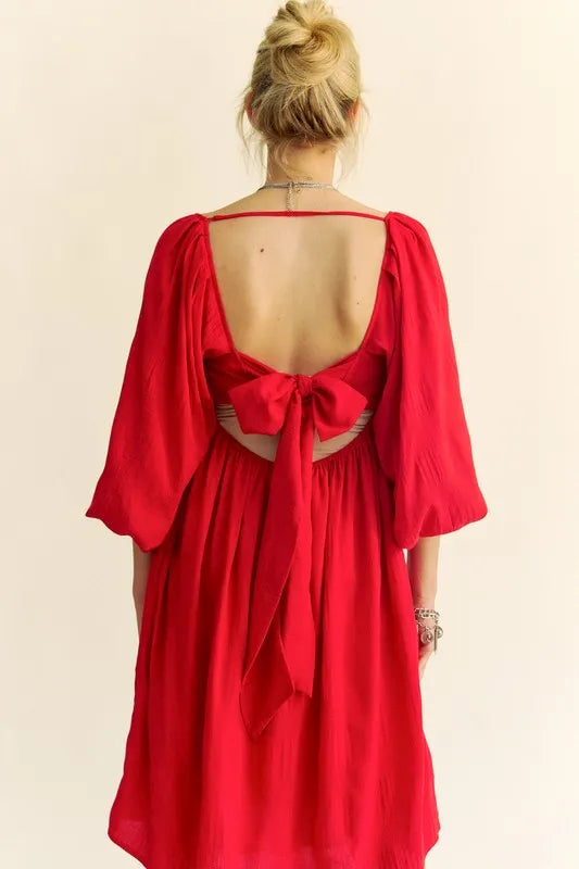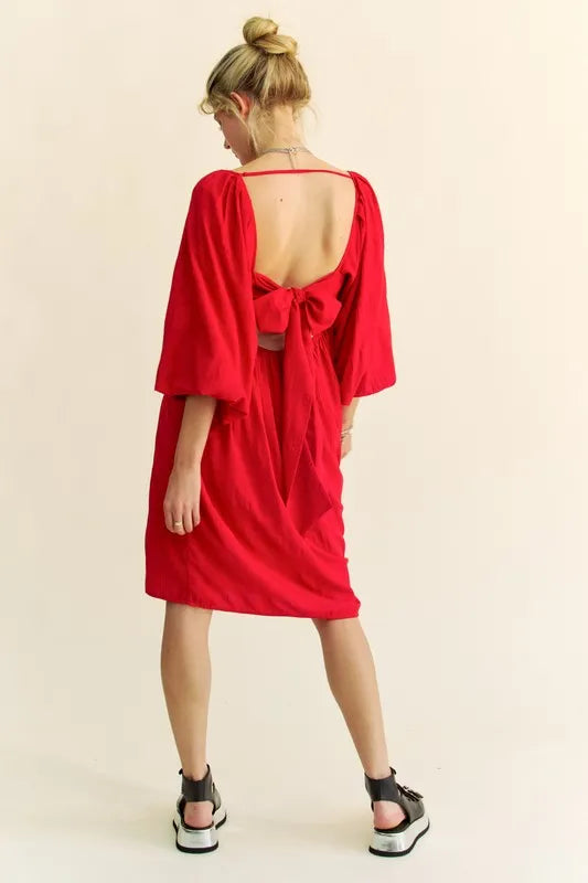 A solid textured fabric puff sleeve tie-back dress is a sophisticated and stylish garment featuring a solid-colored textured fabric, puff sleeves, and a tie-back detail. The textured fabric adds depth and visual interest to the dress, creating a luxurious look. The puff sleeves add a touch of volume and drama, while the tie-back detail cinches the waist for a flattering silhouette. This dress is perfect for a range of events, from daytime gatherings to evening occasions, offering a chic and elegant outfit option.