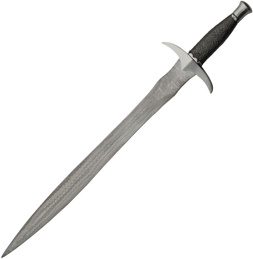 29" (73.66cm) overall. 23" (58.42cm) double edge Damascus steel blade. Black wire wrapped handle. Steel guard and pommel. Fuller groove.... Read more