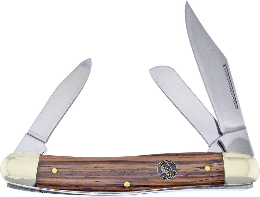Crowing Rooster. 4.63" closed. Mirror finish stainless clip, sheepsfoot, and spey blades. Zebra wood handle. Nickel silver bolster(s). Inlay shield.... Read more