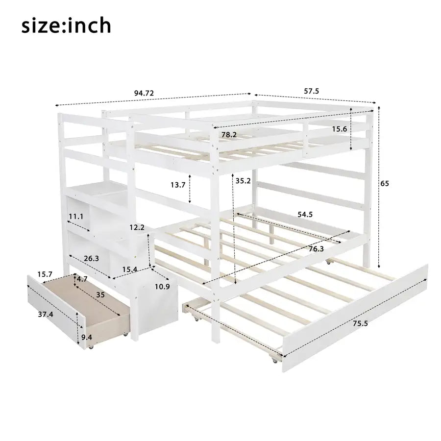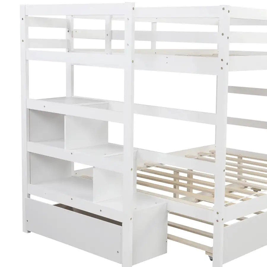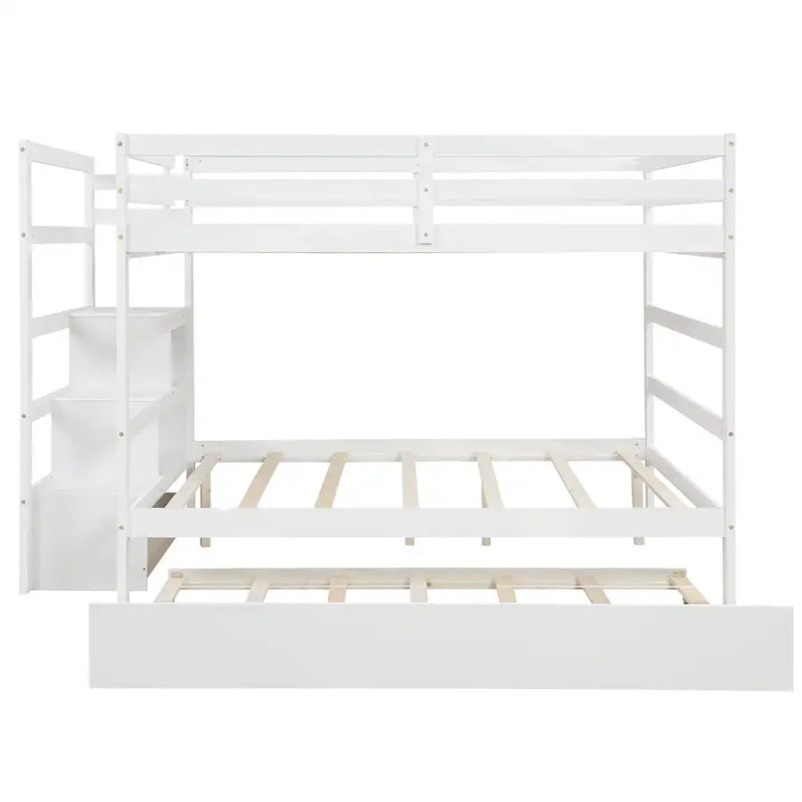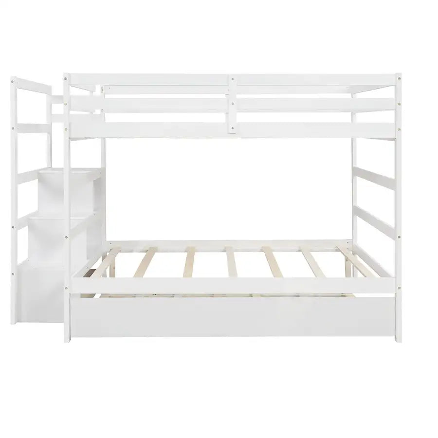If you need extra sleeping space or your family love sleepovers, this Stairway Full-Over-Full Bunk Bed with Twin size Trundle and Drawer is perfect for your home. Two open shelves located beneath the attached staircase and one drawer provide ample storage for your family’ toys and bedding. High-quality, solid pine legs and a strong, durable frame ensures stability and durability for long-term use. Slat kit included so box springs are not required. This bunk bed is designed with a clean silhouette and a hue of elegance. It suits all styles of home decoration, and completes the look of any bedroom.