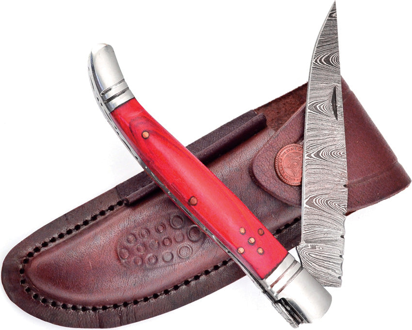 Valley Forge. 4.75" (12.07cm) closed. Damascus steel clip blade. Red pakkawood handle. Stainless bolster(s). Brown leather belt sheath. Please note... Read more