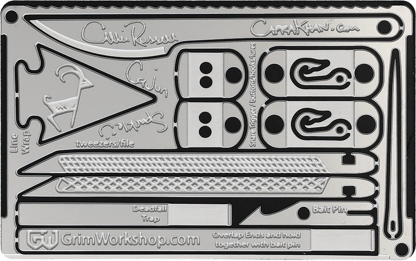 Dimensions: 3.5" x 2". Includes: (2) Spring snare/trigger button; Saw; Knife; (2) Fish hook/Spring snare; Arrow; Line wrap; Blade; Split... Read more