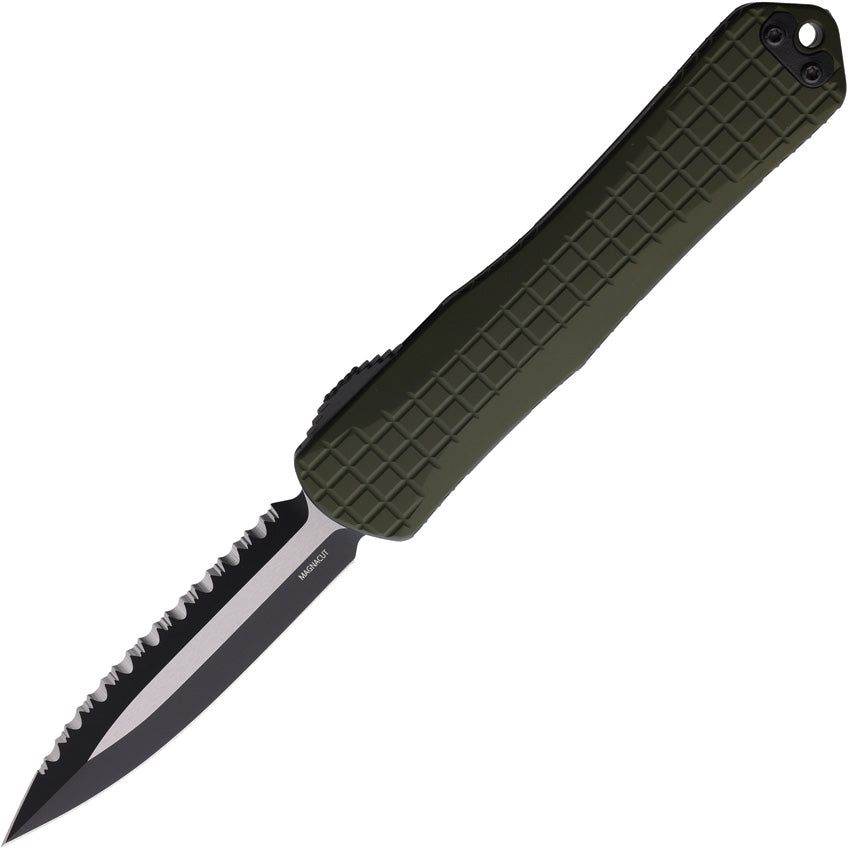 Automatic opening. 5.5" (13.97cm) closed. 3.75" (9.53cm) two-tone finish serrated MagnaCut steel spear point blade. OD green aluminum handle. Glass... Read more