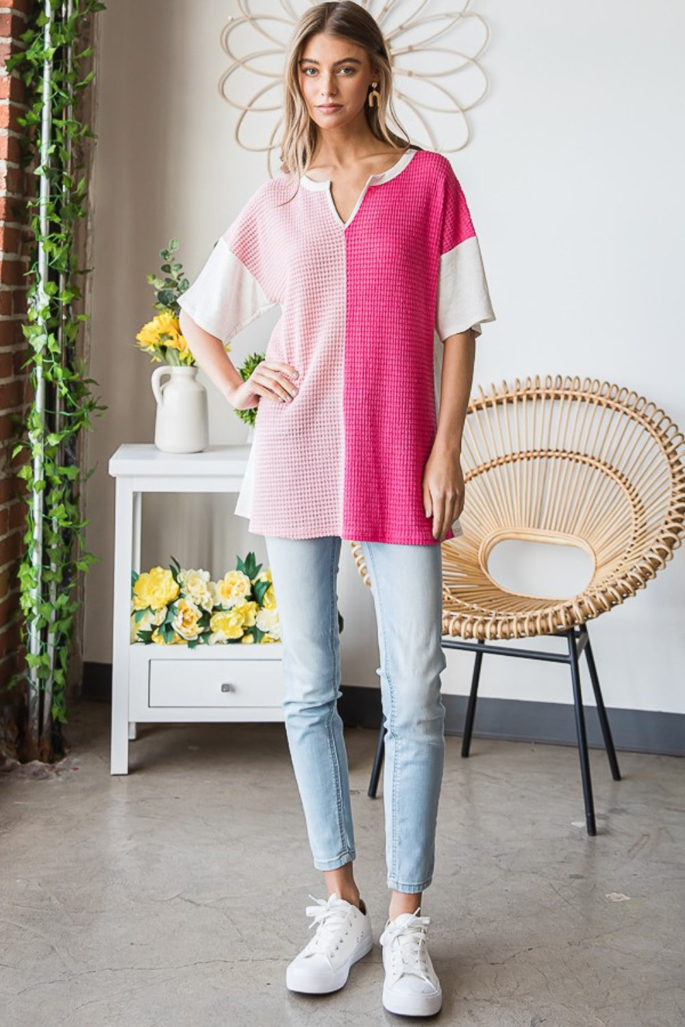 Heimish Full Size Contrast Waffle-Knit Half Sleeve Blouse