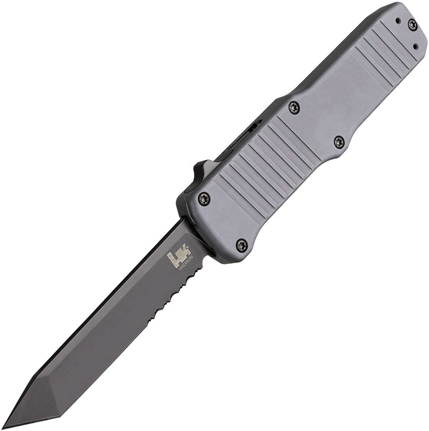 Automatic opening.4.63" (11.76cm) closed. 3.38" (8.59cm) black PVD coated partially serrated 154CM stainless tanto blade. Gray aluminum handle. Pocket clip.... Read more