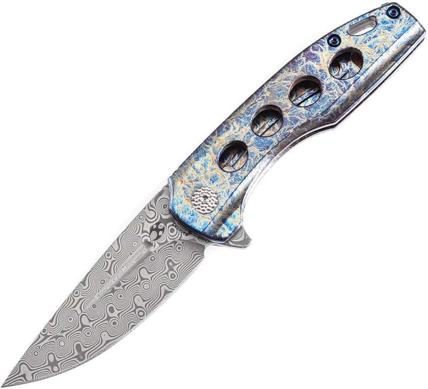 4" (10.16cm) closed. 3" (7.62cm) Damascus steel blade. Lightning strike anodized titanium handle. Extended tang. Lanyard hole. Pocket clip. Black... Read more