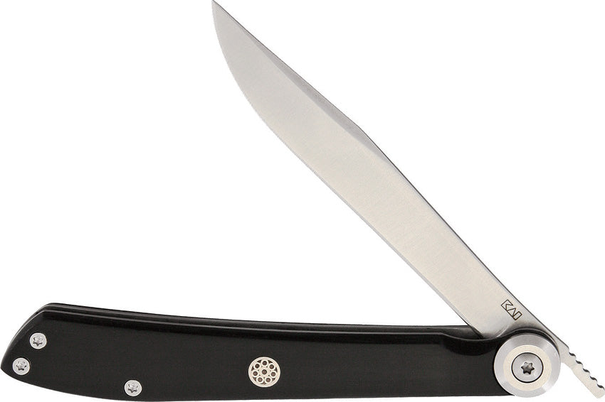 4.13"" closed. 3.25"" satin finish 420J2 stainless blade. Black POM-Griffe handle. Inlay shield. Extended tang. Black leather sheath. Boxed. Cannot... Read more