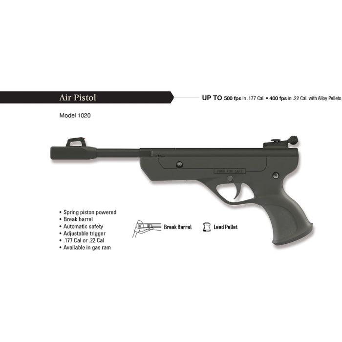 16" overall. Weight: 3.4lb. Velocity: 550 fps in .177 caliber. Front and rear sights. Automatic safety. Spring piston powered. Adjustable... Read more
