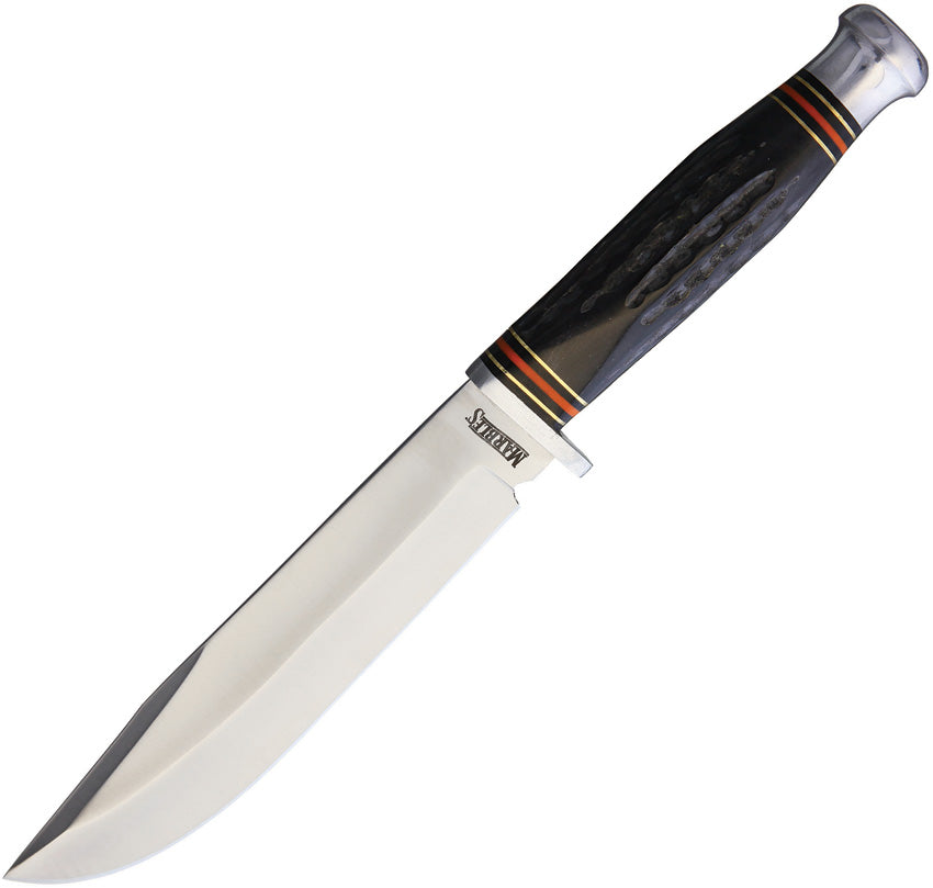10.75" overall. 6" satin finish stainless clip point blade. Jigged horn handle. Stainless guard and aluminum pommel. Brown leather belt... Read more